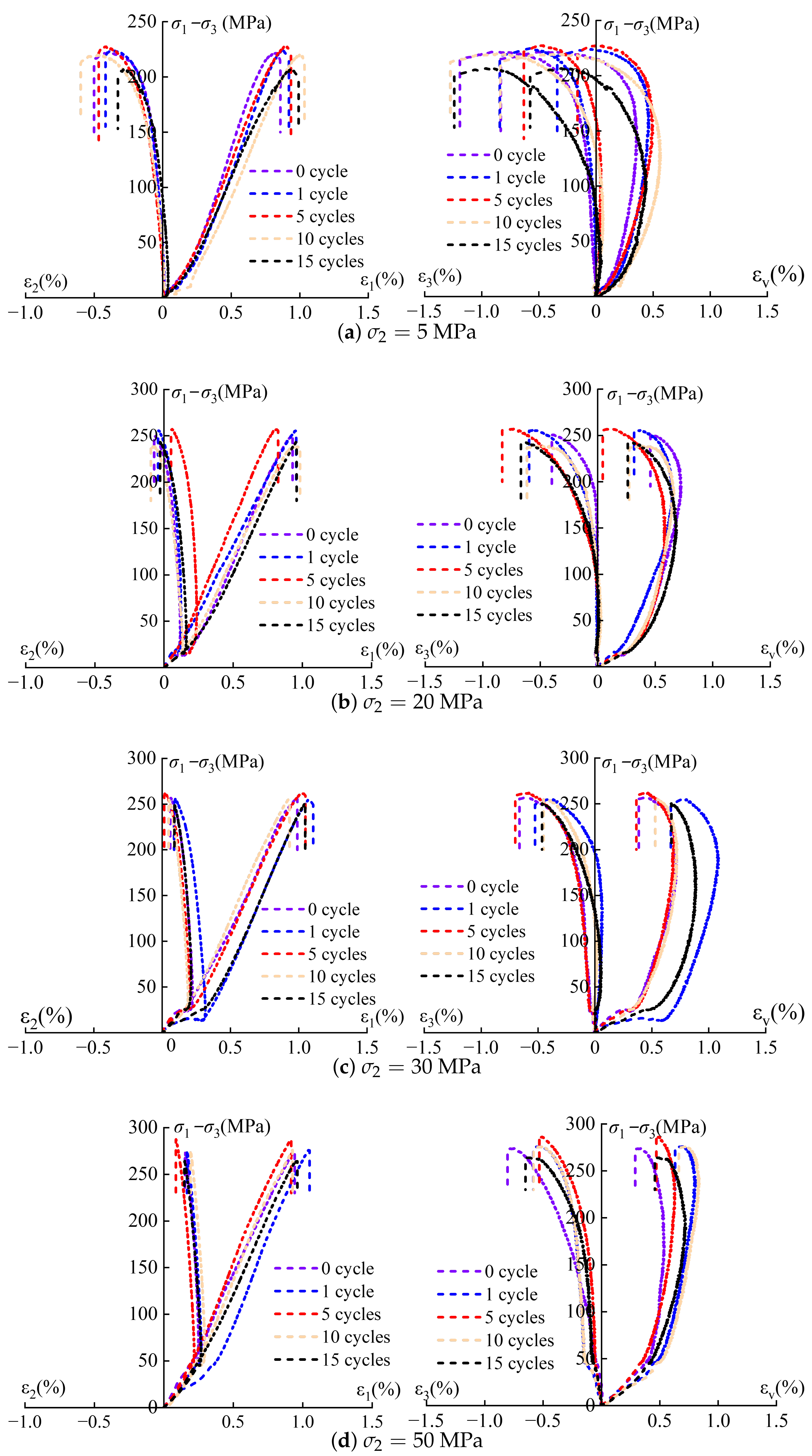 3.2. True-Triaxial Stress–Strain Curves