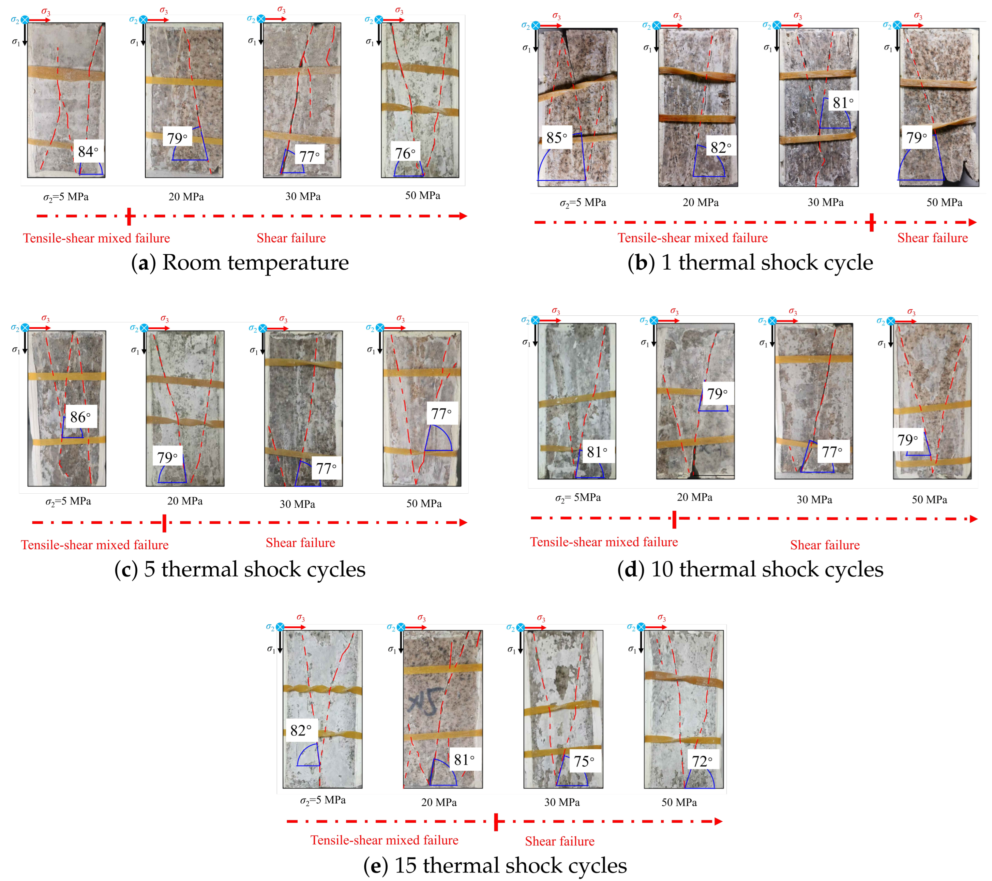 - Macroscopic failure is characterized by asymmetric V-shaped fracture patterns with dominant fracture planes oriented approximately parallel to the direction. Increasing leads to a gradual transition from tensile–shear mixed failure toward shear-dominated behavior. Nevertheless, cyclic thermal shock facilitates the persistence of tensile–shear cracking even under relatively high intermediate principal stress. The fracture angle decreases with increasing and varies nonlinearly with the number of thermal shock cycles.
