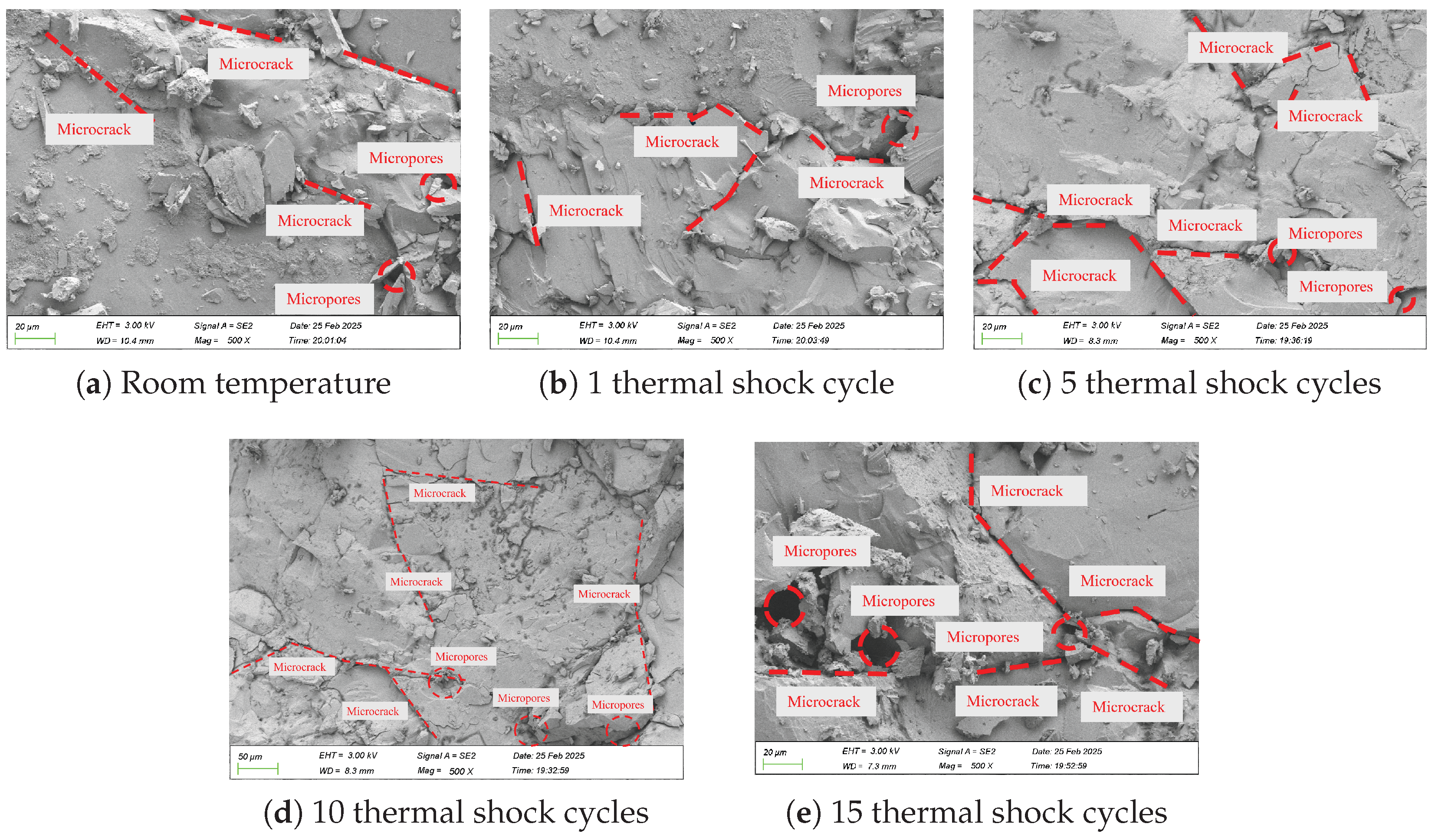 - Cyclic thermal shock induces pronounced microstructural degradation in granite. With increasing thermal shock cycles, microcrack density rises markedly, and the dominant cracking mode evolves from predominantly intergranular to a mixed intergranular–transgranular pattern. Progressive linkage of dispersed microcracks results in the formation of an interconnected fracture network, which is consistent with the observed reduction in P-wave velocity and the associated decline in mechanical strength at the macroscopic scale.