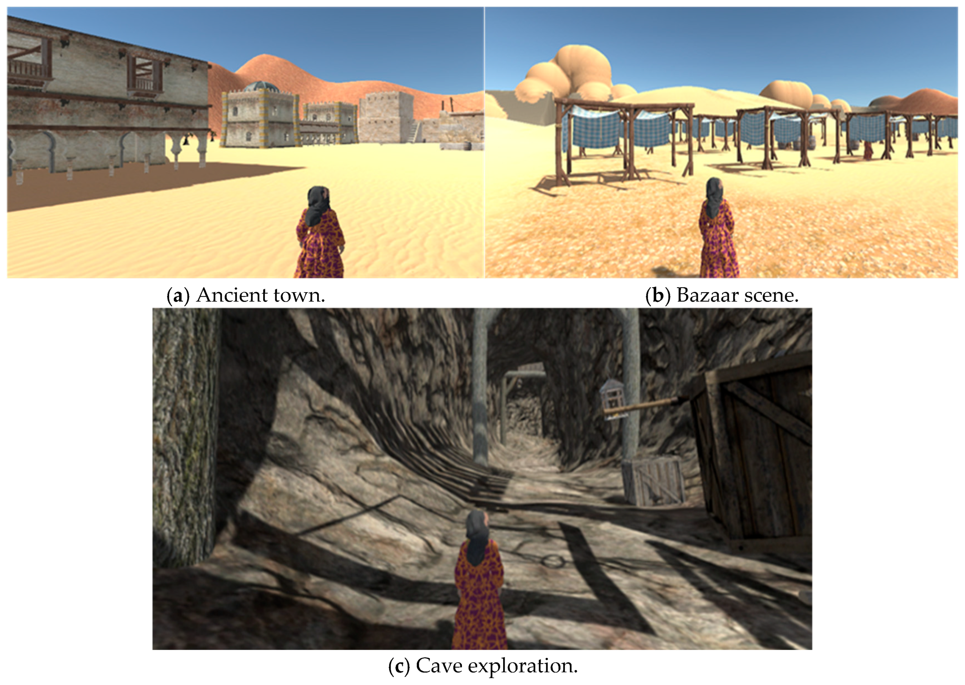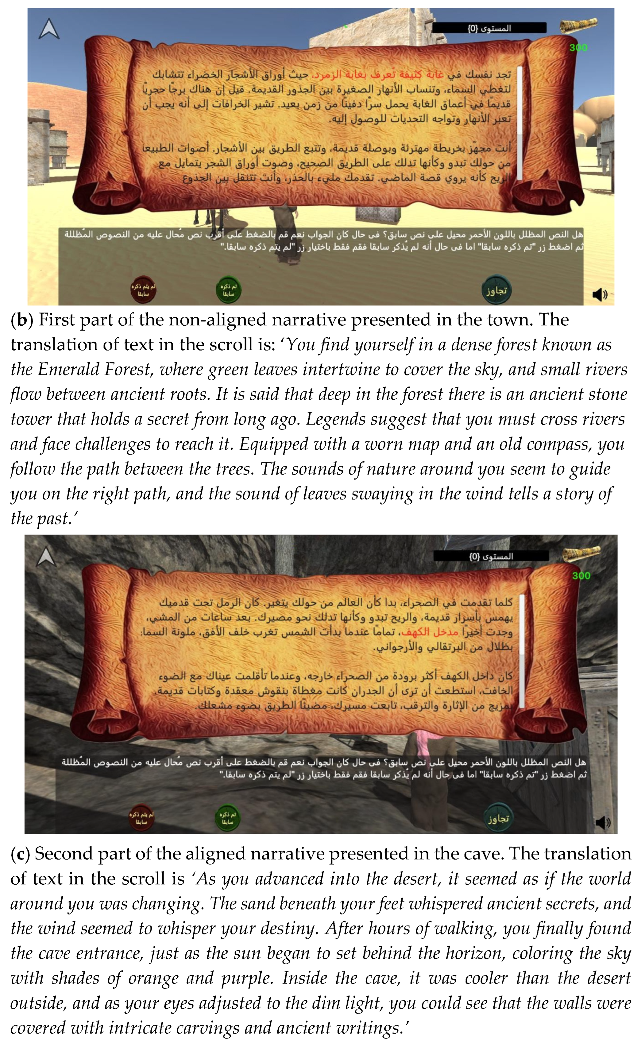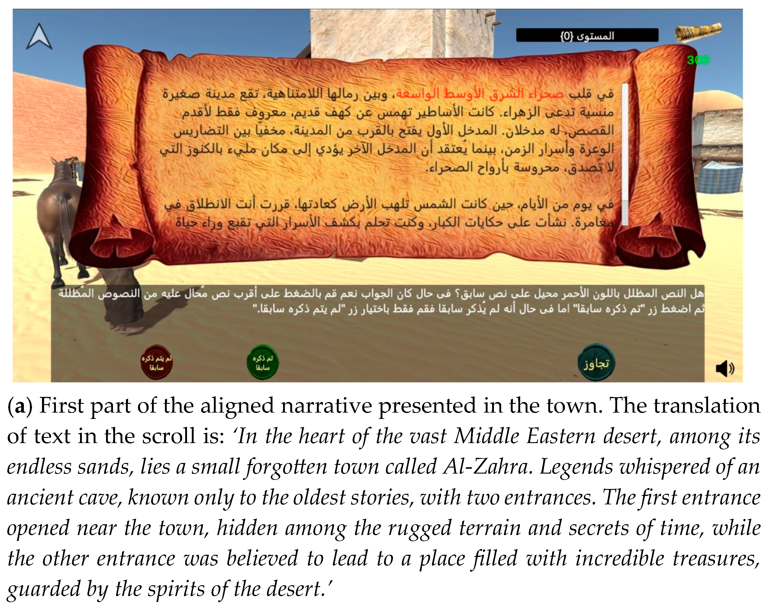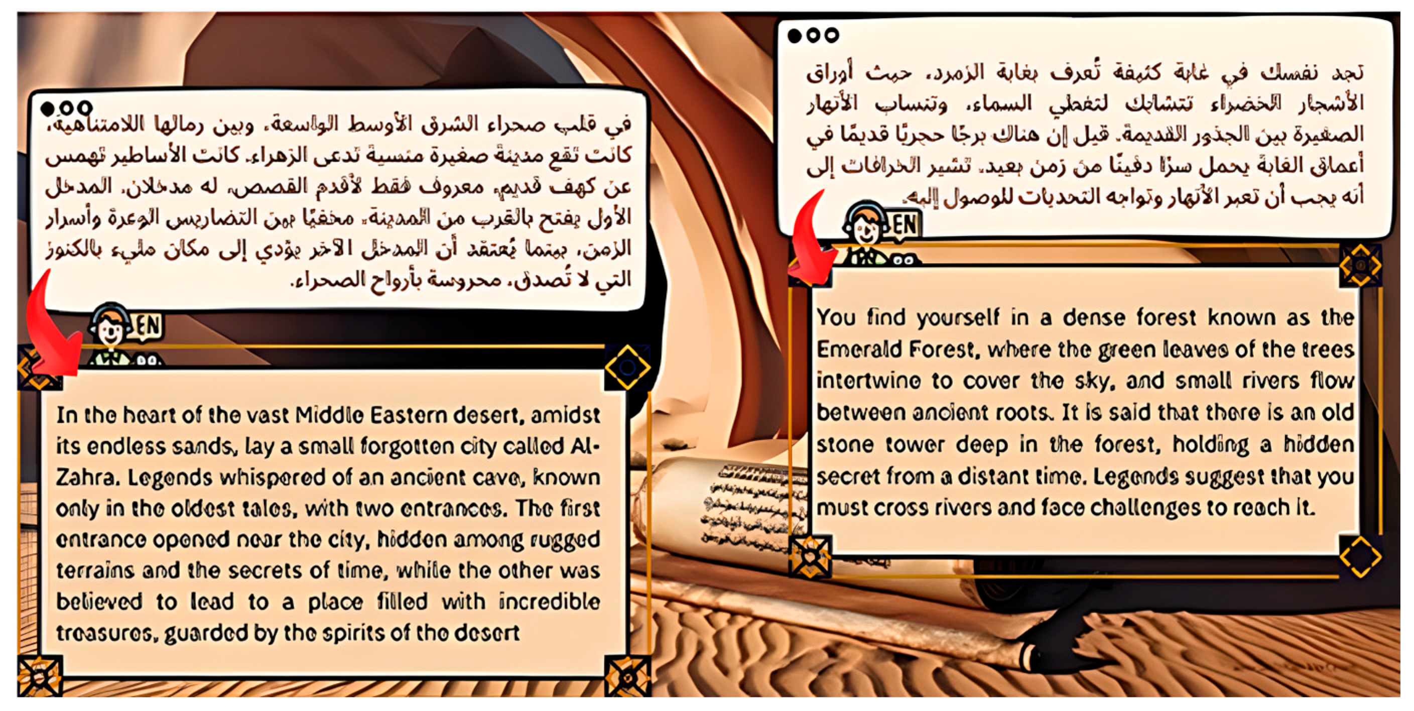 A large language model (LLM) provided by the OpenAI API, namely GPT-4o, version: 1.26.0 (released and accessed on May 2024), was used to generate narrative texts due to its higher capability to generate coherent and contextually adequate Arabic text. To come up with the narratives, we used a Python 3.12.3 script to automate the process with the same prompt template mentioning the clear role and task of the model and a detailed input structure. These are the inputs to the prompt: story theme or title, text length, narration perspective, and writing style. These inputs were identical when running the prompt for each generated text: between 400 and 800 words, second-person perspective, descriptive short style that would fit into the game as a video game, and structure (exploration → obstacles → travel journey → reflective ending). The only difference between the two is that the former type was a set of stories told in Modern Standard Arabic, in the imaginary city of Al-Zahra (The Radiant City). These narratives portrayed a second-person journey through a desert to a prehistoric cave where there were two exits and ended with a trip back to the town. It was explicitly noted that it should be thematically aligned with the desert-cave environment. The second type of prompt created contrasting stories that intentionally went off-course from the environment of the game. An example is the sea voyage in the Emerald Forest, with rivers, fertile foliage, and towers of stone, where there was no theme overlap with the desert-cave environment.