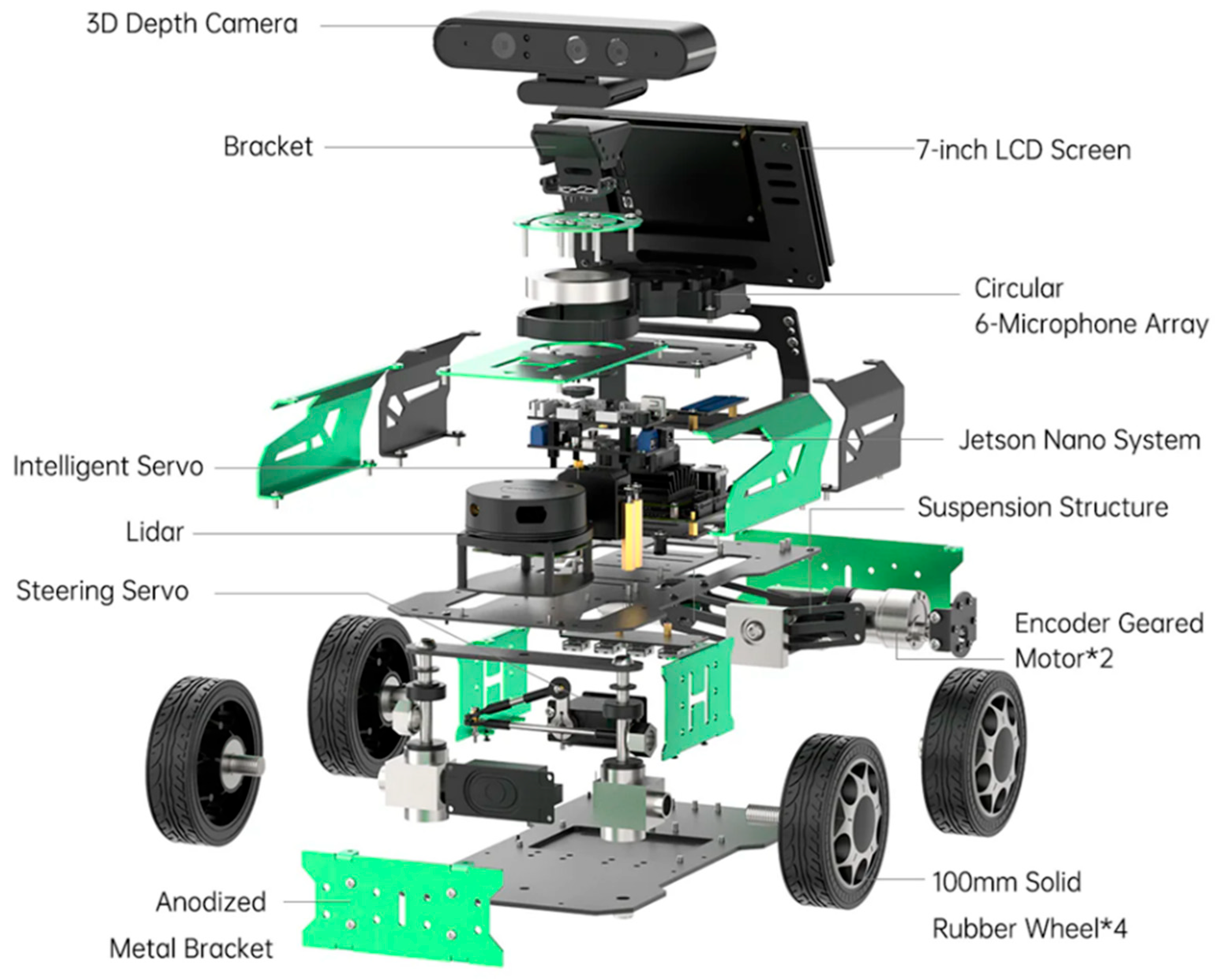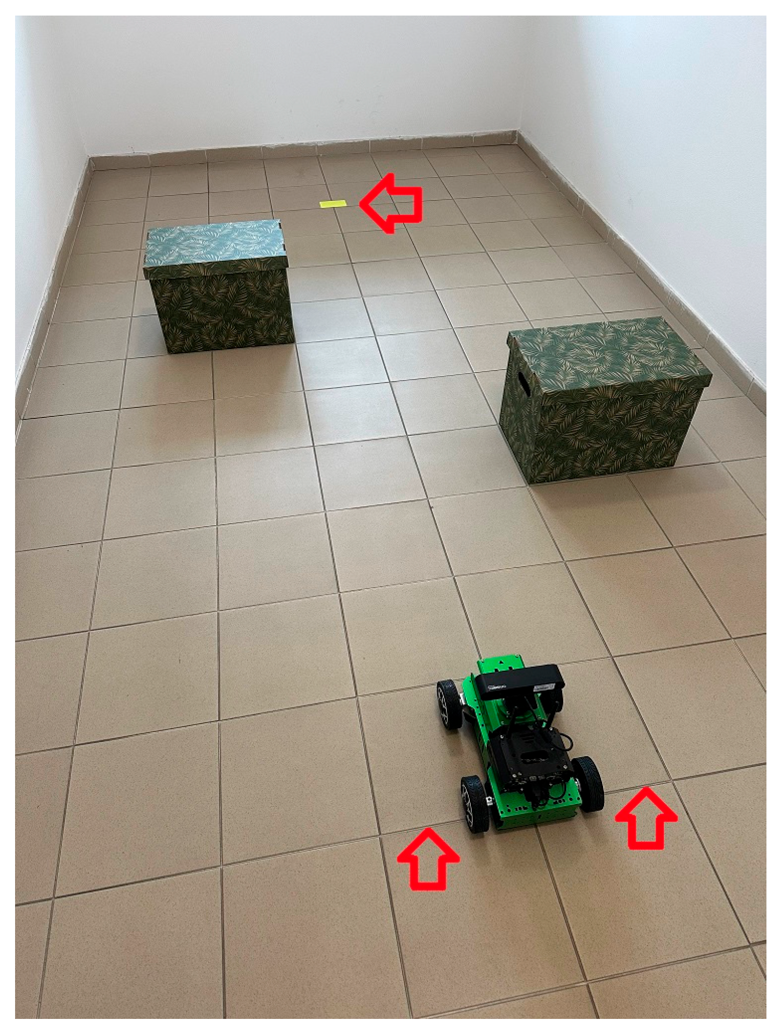 To ensure that our investigation is grounded in a realistic and reproducible context, all experiments were conducted using the Hiwonder JetAcker, a mid-sized mobile robotic platform that is increasingly adopted in both research and educational environments. The robot’s compact form factor (0.26 m in width and 0.24 m in height) makes it particularly suitable for operation in constrained indoor spaces typical of offices and laboratories. Perception is provided by a 2D RPLIDAR A1 laser rangefinder with a 90° field of view and a maximum range of 6 m, a sensing configuration that is representative of standard planar navigation setups in indoor robotics. Computation is performed onboard by an NVIDIA Jetson Nano module (Santa Clara, CA, USA), which executes the full navigation stack and serves as a realistic benchmark for the computational resources available to many comparable mobile robots [