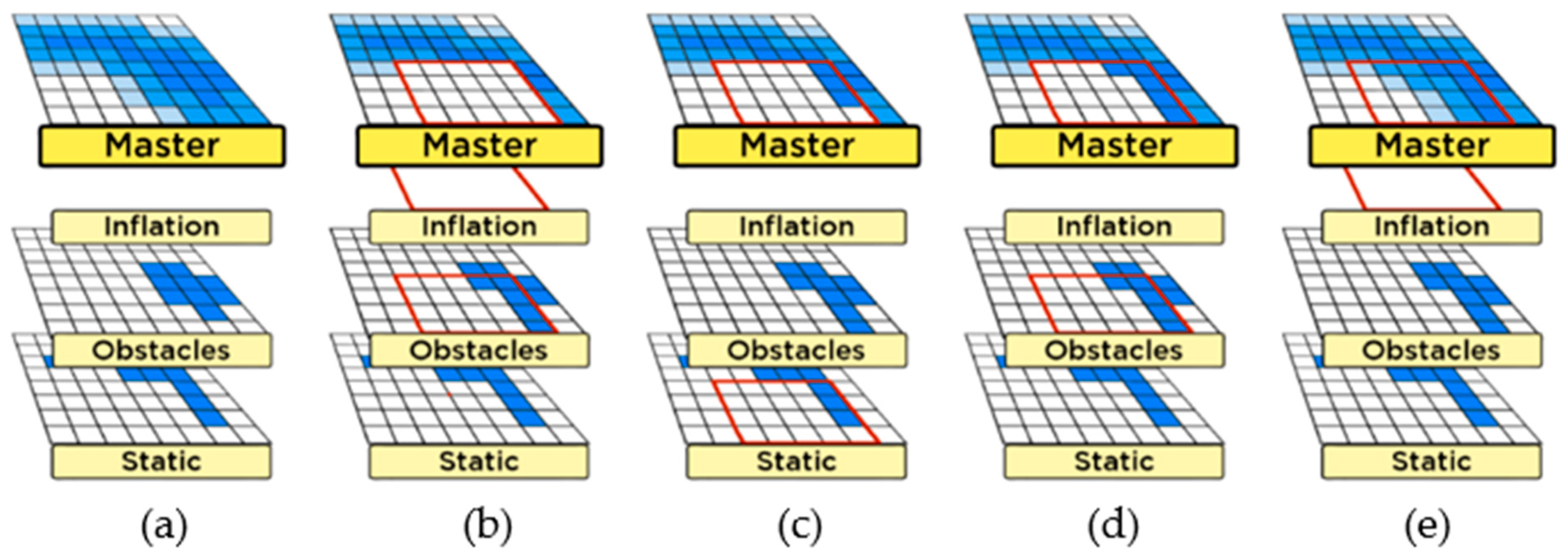 Figure 3b. The union of these regions defined a minimal region of interest (ROI), ensuring that computation was restricted to modified areas. In the subsequent updateValues phase, layers were applied sequentially within this ROI—first the Static Map, followed by the Obstacles layer, and finally the Inflation layer (see