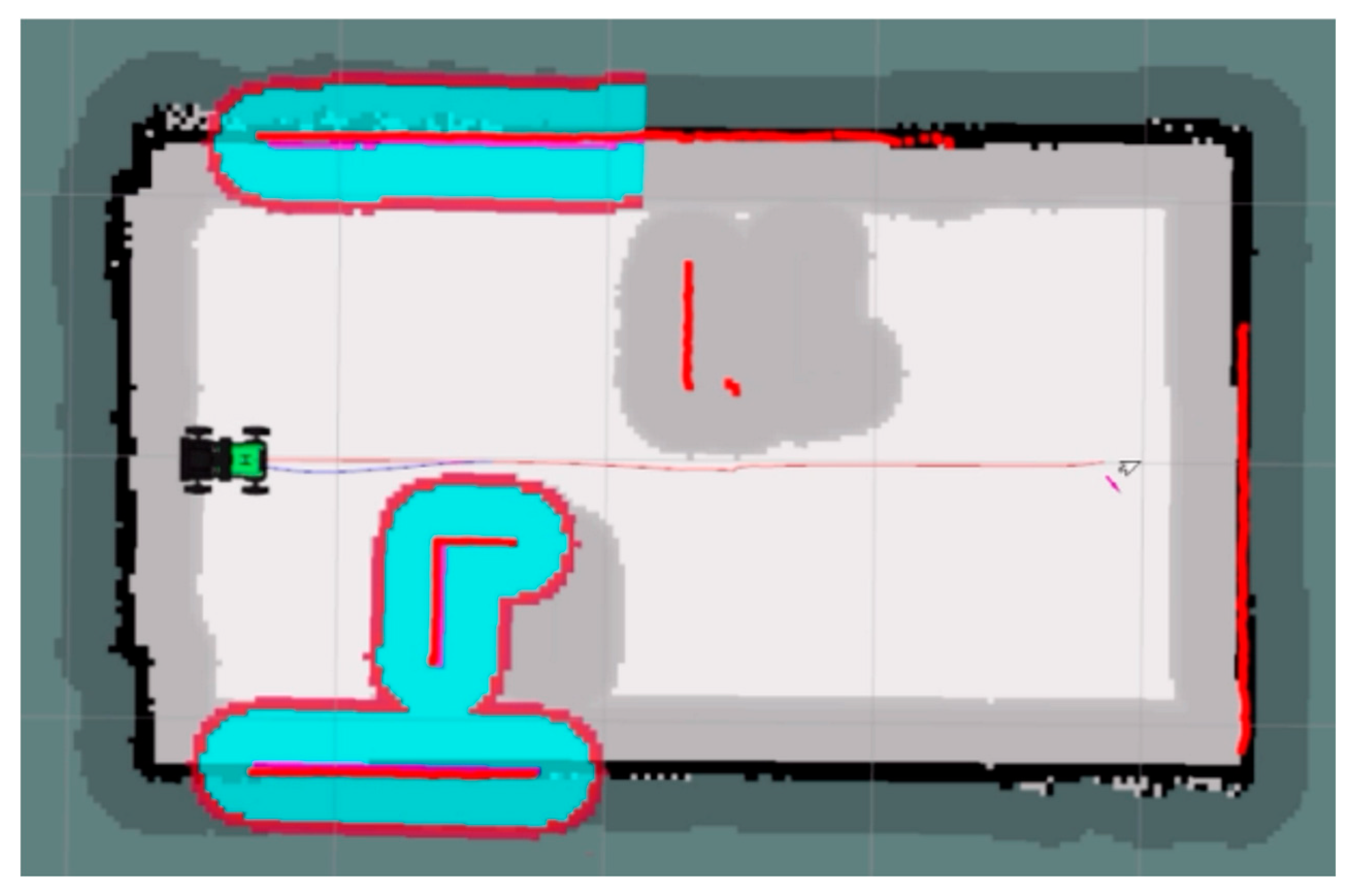Figure 2. Consequently, the planner does not compute trajectories around the physical obstacles themselves, but rather around their inflated representations in the costmap. From a geometric perspective, this implies that the effective width of any navigable passage is reduced by twice the value of the inflation_radius.