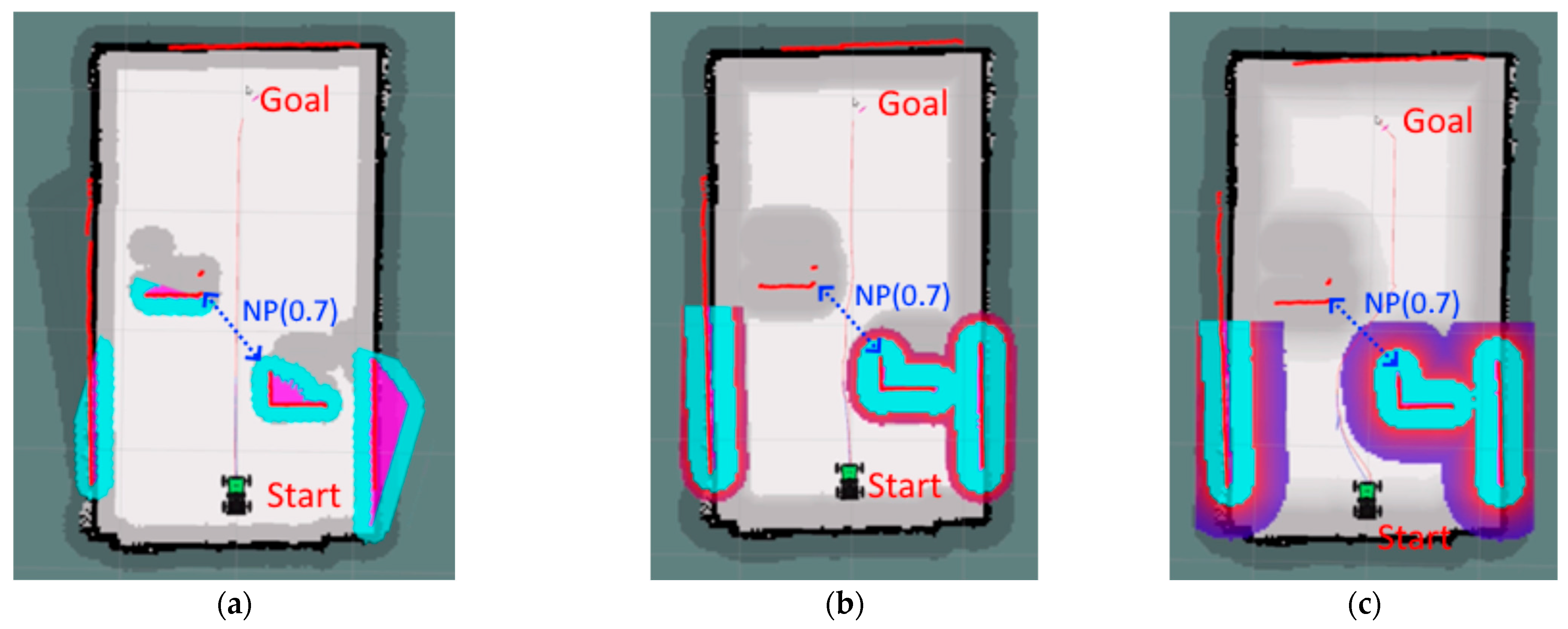 Figure 3c–e). This strict ordering preserved logical consistency: dynamic obstacles overwrote static free space, and inflation costs were computed from the final obstacle configuration. Inflation values were assigned based on the Euclidean distance to the nearest occupied cell using a decay function governed by the cost_scaling_factor.