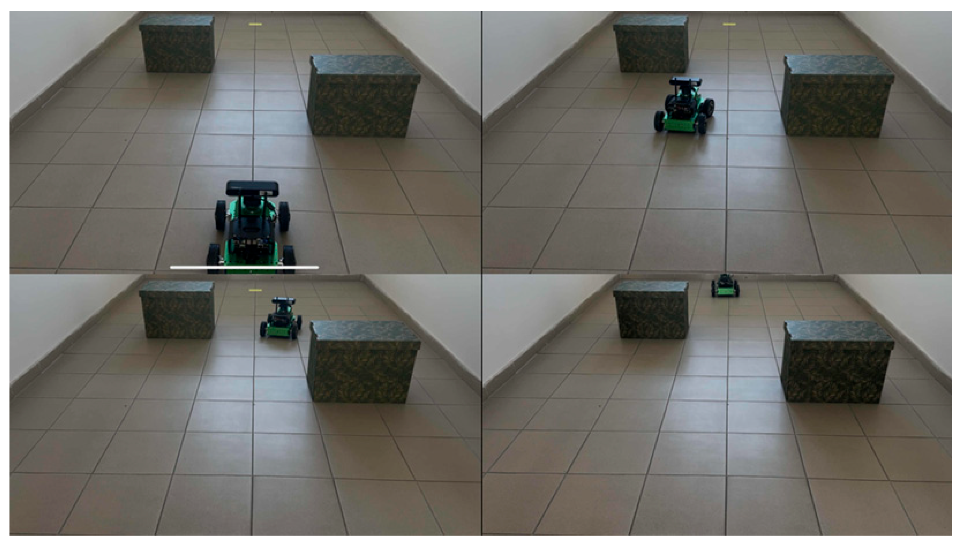 Figure 7, the test setup included a narrow corridor formed by two boxes, creating a critical “doorway” with an effective width of 0.7 m, representative of constrained passages commonly encountered in office-like settings. During these trials, the robot was configured with