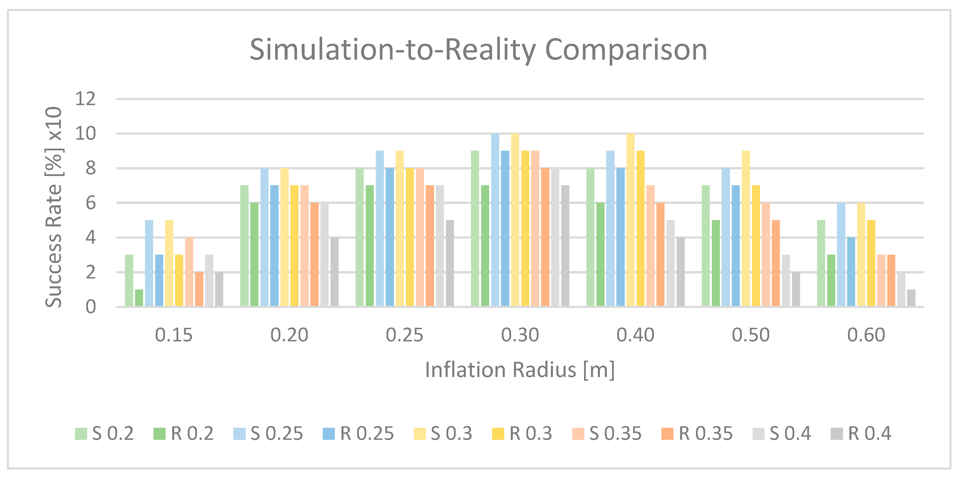 The divergence between simulation and physical deployment becomes evident when the success rates are compared across the full inflation-radius sweep, as illustrated in