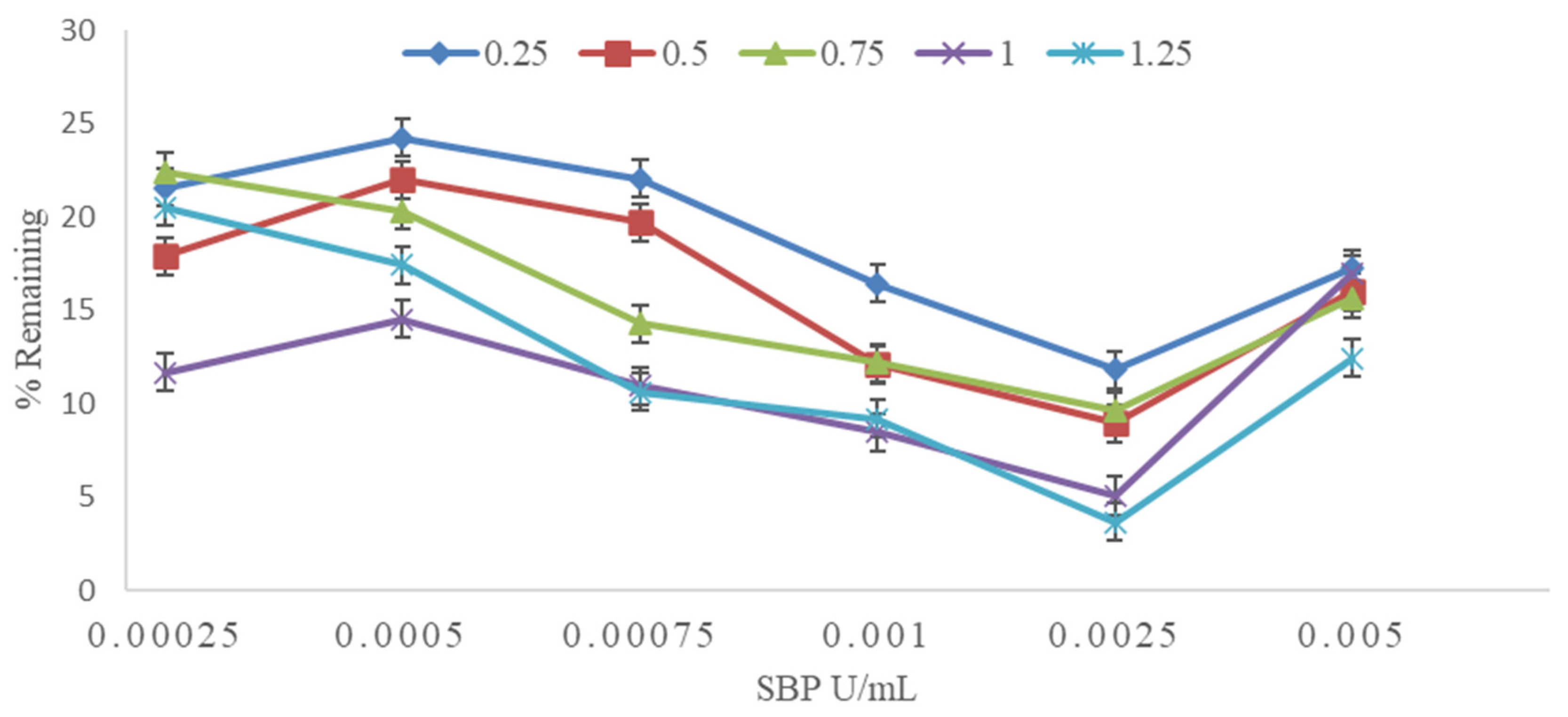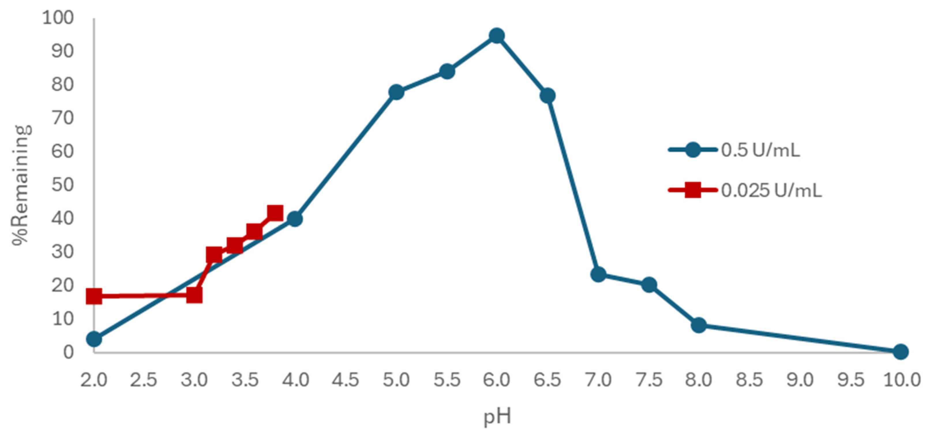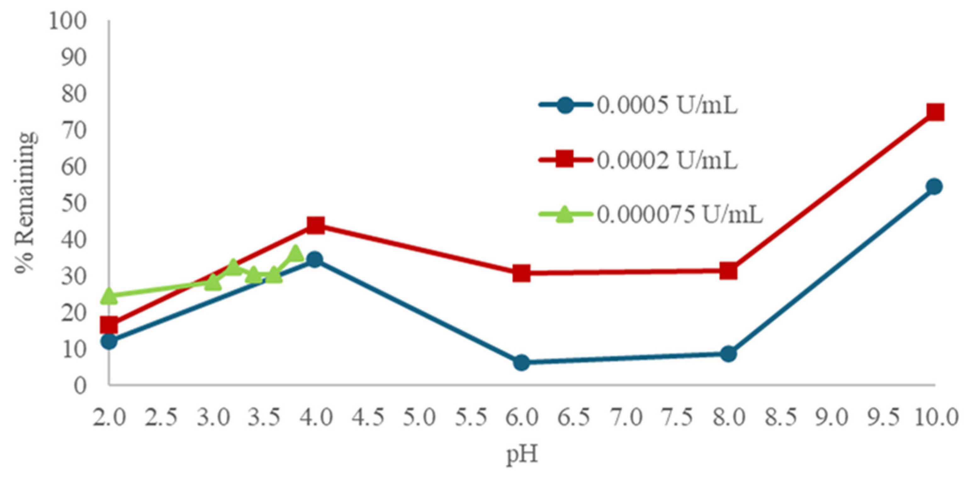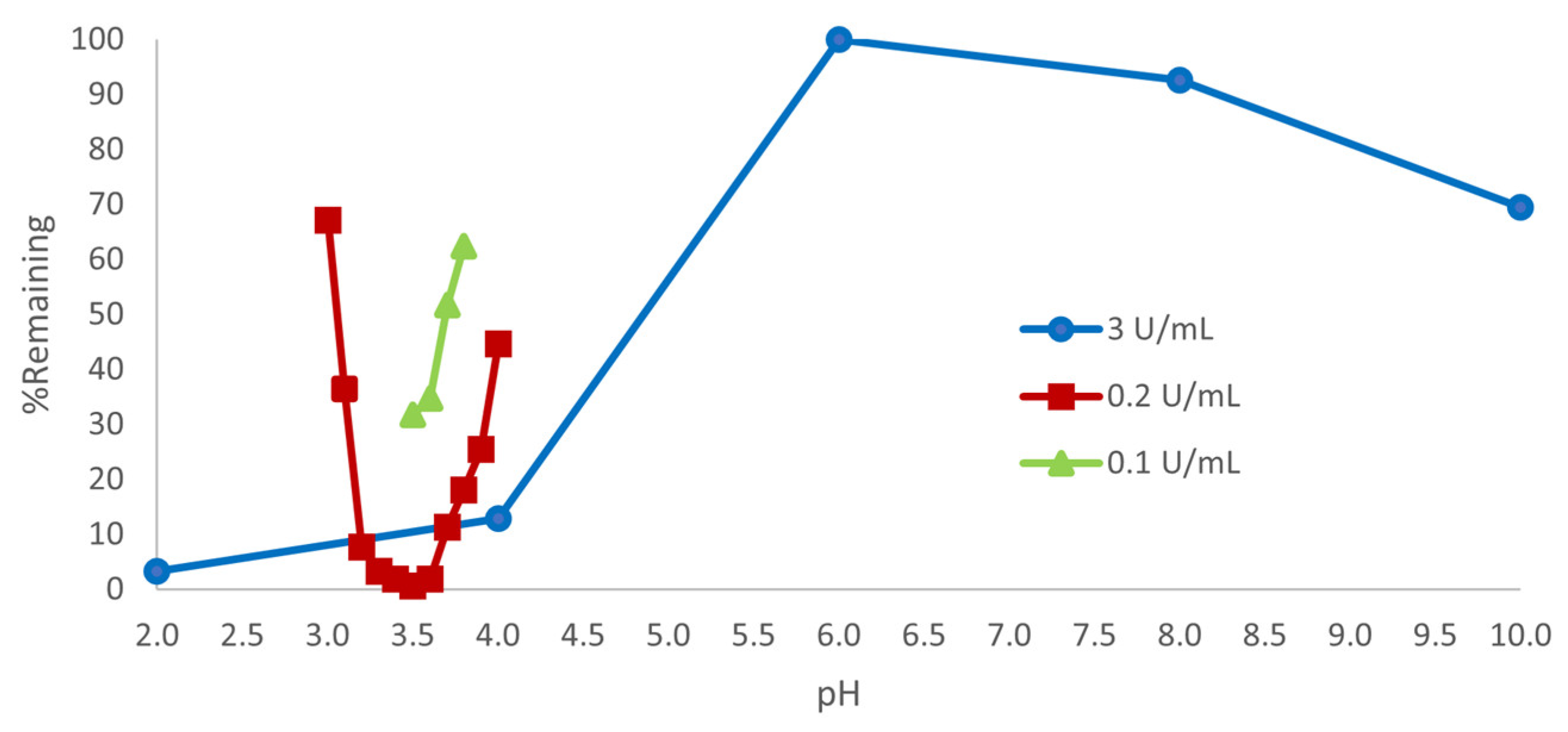 symbol, at a high enzyme activity, which can be seen to be excessive. Over a narrower pH range with HPLC analysis, even 15-fold lower SBP activity is seen to be excessive (as many data points in the pH range 3.2–3.6 show less than 10% remaining, resulting in a loss of pH resolution), but the outline of the classical bell-shaped pH dependence curve is seen, Figure 2,