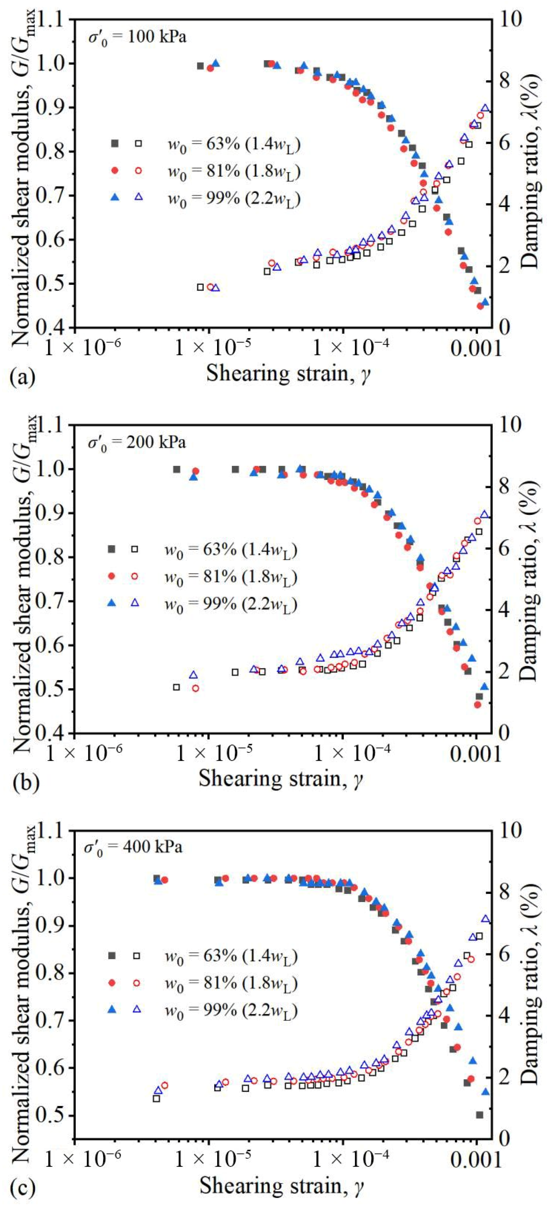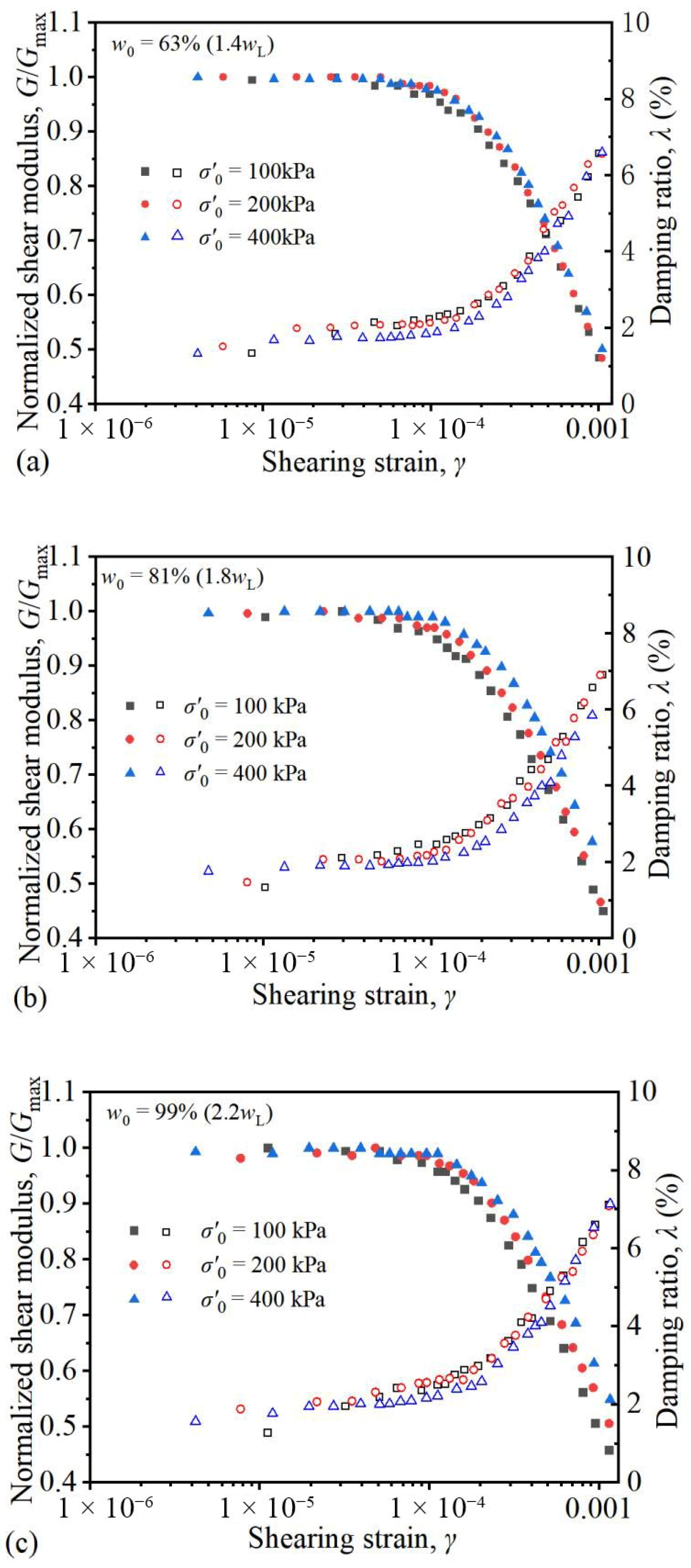 - Chen, G.X.; Liu, X.Z.; Zhu, D.H.; Hu, Q. Experimental study on dynamic shear modulus ratio and damping ratio of recentlydeposited soils in Nanjing. Chinese J. Geotech. Eng. 2006, 28, 1023–1027. [Google Scholar]