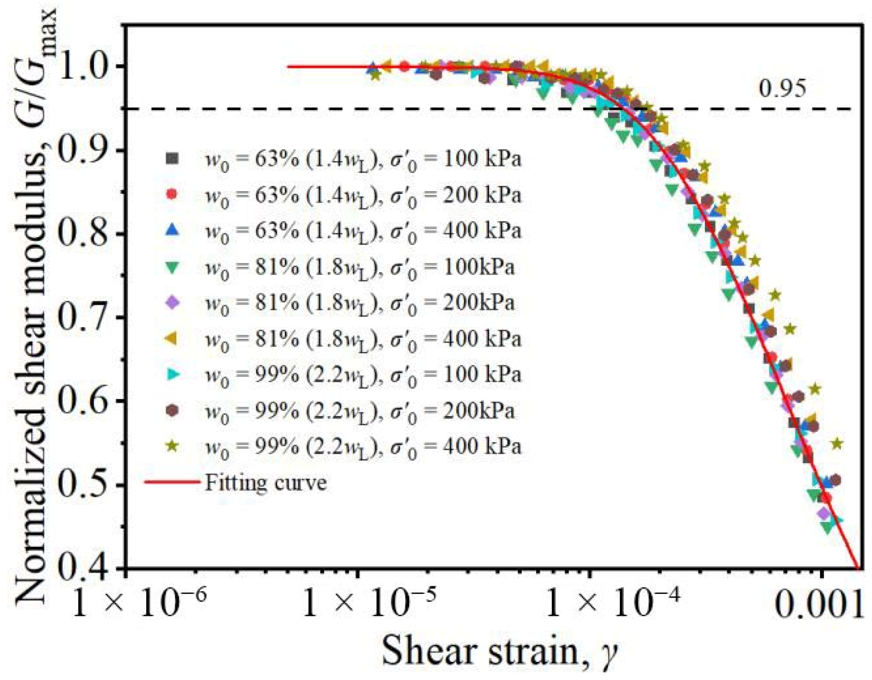 - The variation in and did not alter the intrinsic evolution trend of the remodelled clay curve and curve. Curves from all test conditions converged within a narrow region, demonstrating favourable unified behaviour. Based on the test results, a predictive model for small-strain dynamic shear modulus considering the influence of was established, providing a basis for calculating dynamic parameters in relevant engineering applications.