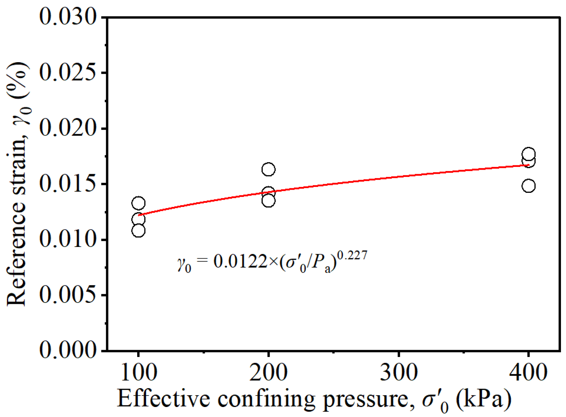 - The of reconstituted clay is significantly influenced by and exhibits a monotonically increasing trend with the decrease of or the increase of , with the enhancing effect on being more pronounced at low conditions. For specimens with different values, exhibits a monotonically increasing trend with decreasing . After normalisation by confining pressure, the data of and under different converge to a single characteristic curve, which can be described by a unique negative power function.