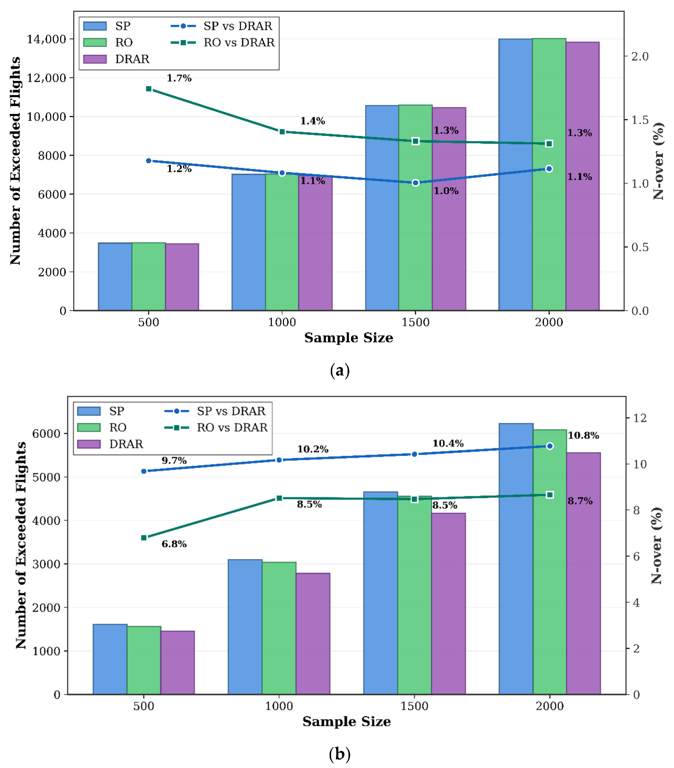 - Number of Over-Threshold Flights (): The measurement of flights that exceed a predetermined delay threshold (90 min) within each delay scenario, reflecting the model’s capability to control excessive delays.