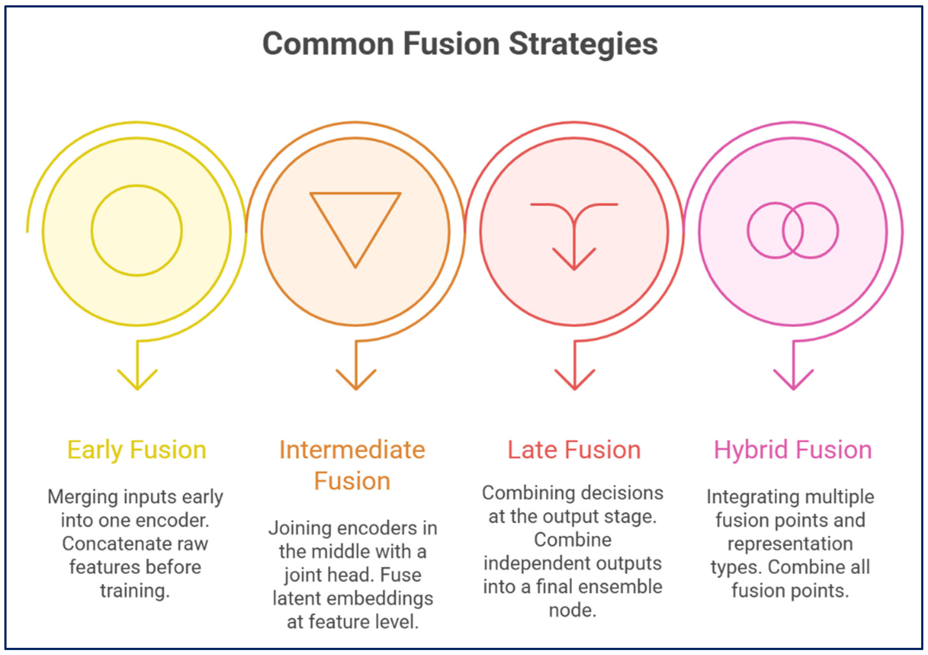 53]. The most predominant fusion strategies used in multimodal deep learning are generally classified into four broad strategies: early (input/feature-level), intermediate (feature/joint level), late fusion (decision-level), and hybrid fusion (combination of multiple fusion strategies) [