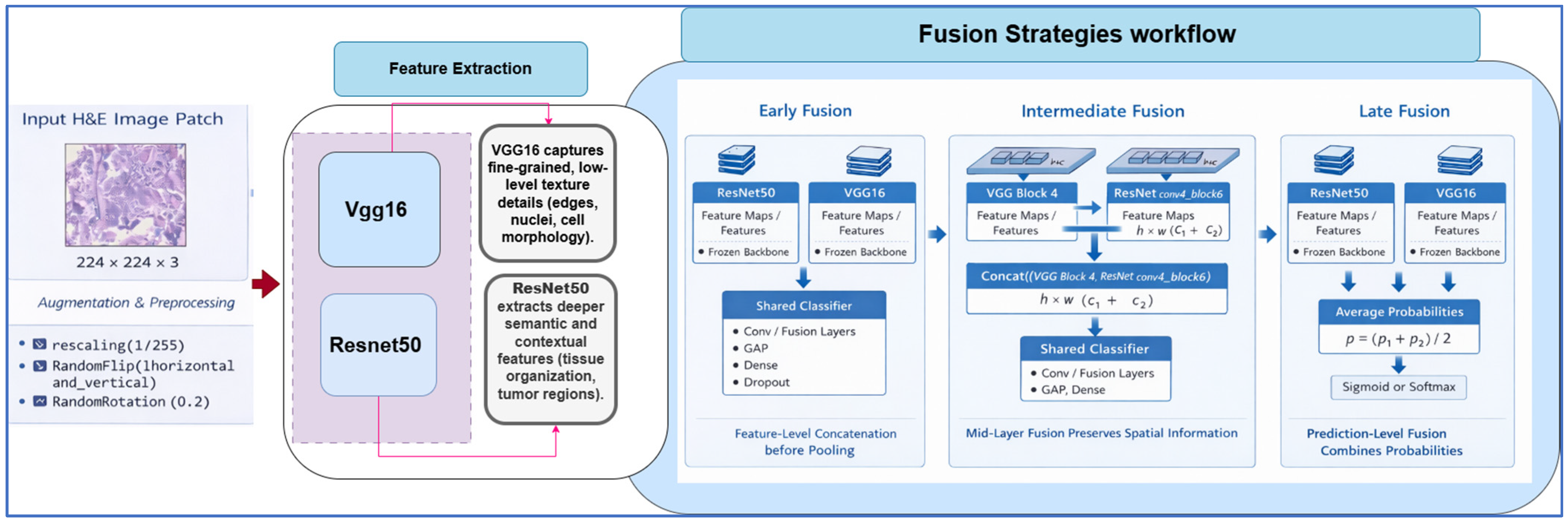 53]. In histopathology tasks, hybrid fusion can be used to combine high-dimensional image features with low-dimensional features from other clinical sources [