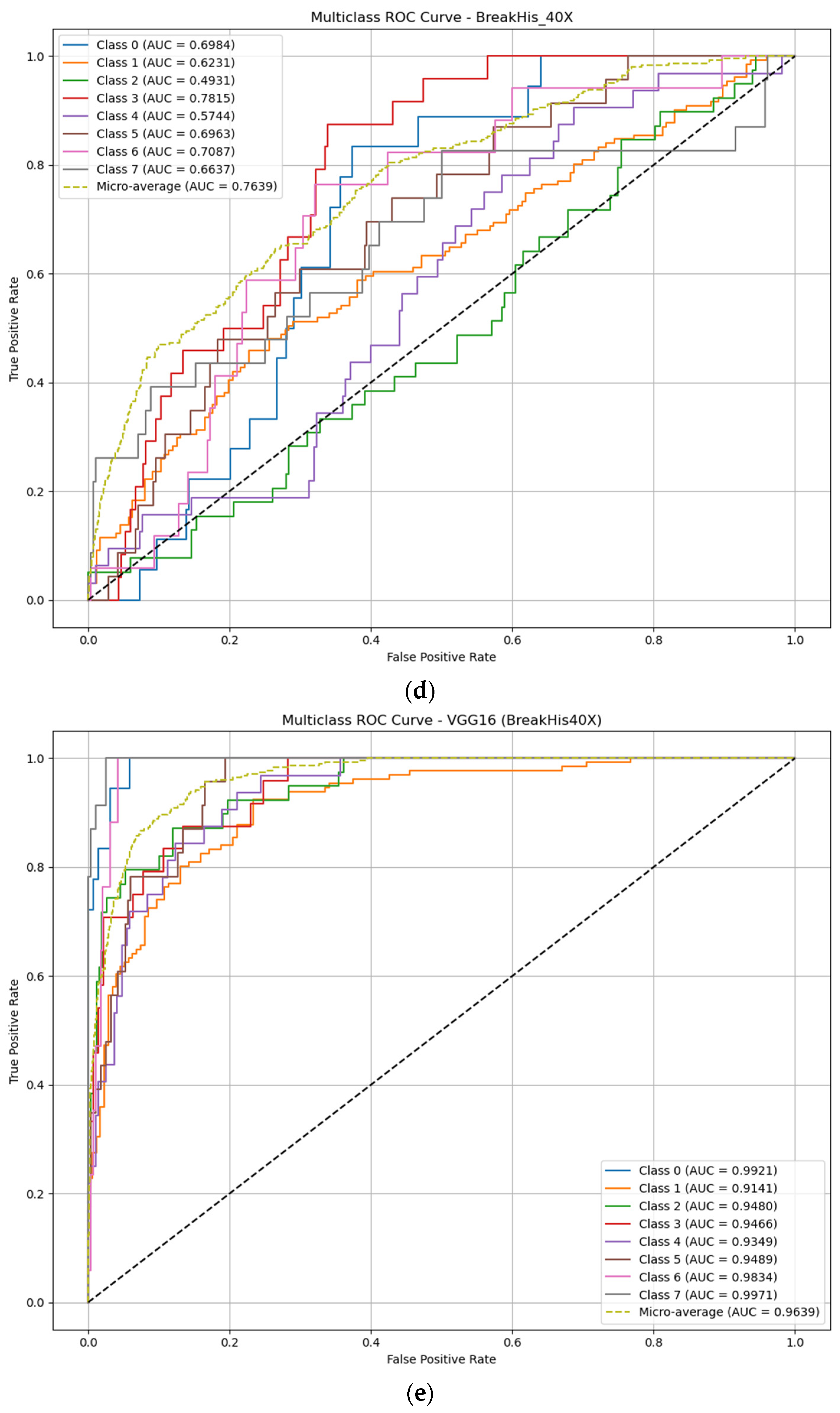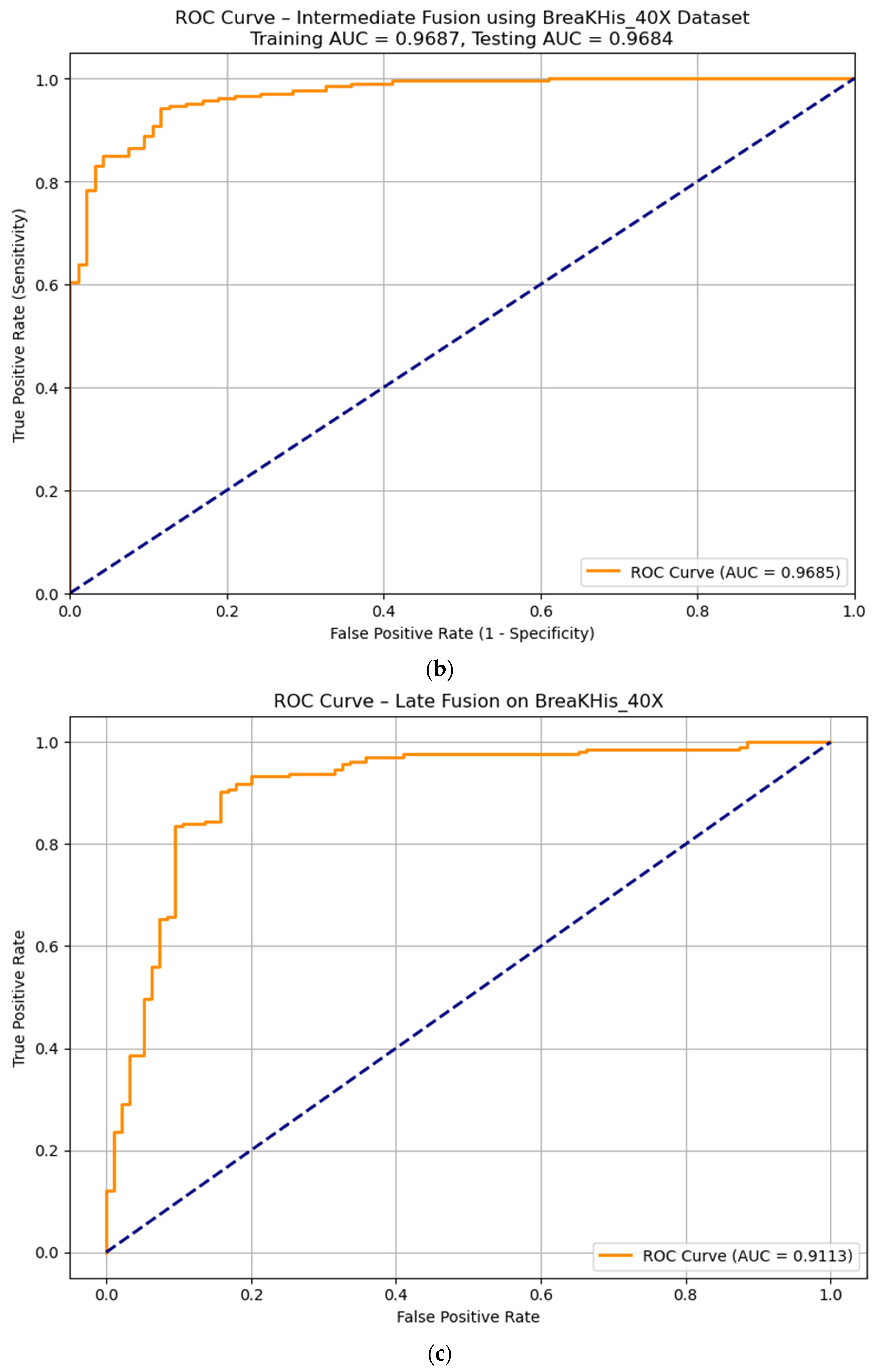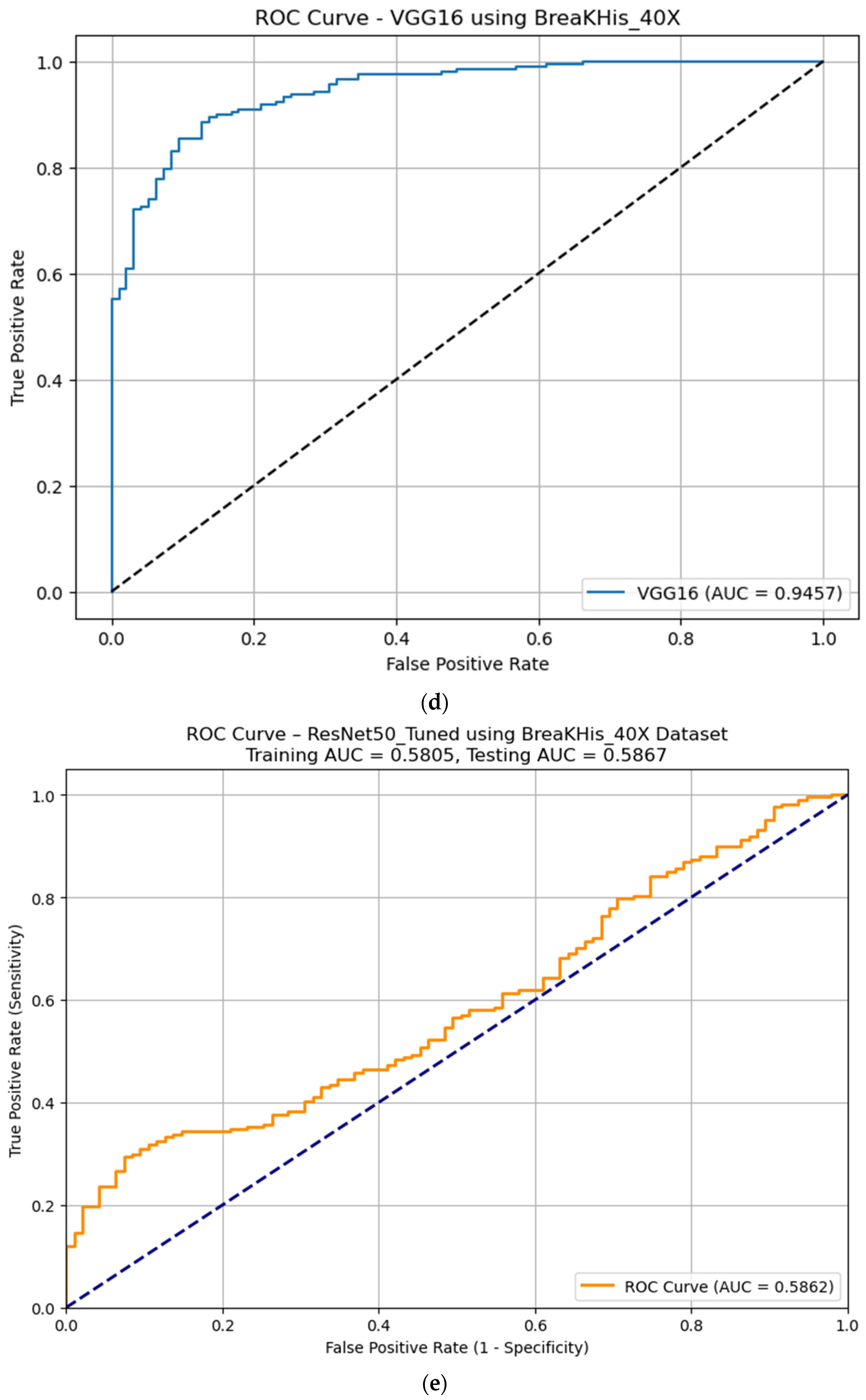 62]. In 2025, Das et al. implemented an ensemble learning framework using multiple pre-trained deep learning models to improve the accuracy of diagnosing invasive ductal carcinoma (IDC) from histopathology images. Breast histopathology images at three magnification levels (100×, 200×, and 400×) were used. Pre-trained models, including ResNet50, Xception, MobileNetV2, VGG16, and VGG19, were used to extract features from histopathology images, and a late fusion strategy was implemented through the average and weighted ensemble learning of multiple pre-trained models. The obtained results indicated that the weighted average ensemble model (combining ResNet50, VGG16, and VGG19) achieved the best performance across magnification levels, with accuracy = 97.27%, AUC = 0.975, and F1-Score ≈ 0.97, while ResNet50 was the best standalone model, achieving approximately 98% accuracy on 100× images. The overall results showed that the ensemble model achieved better generalization [
