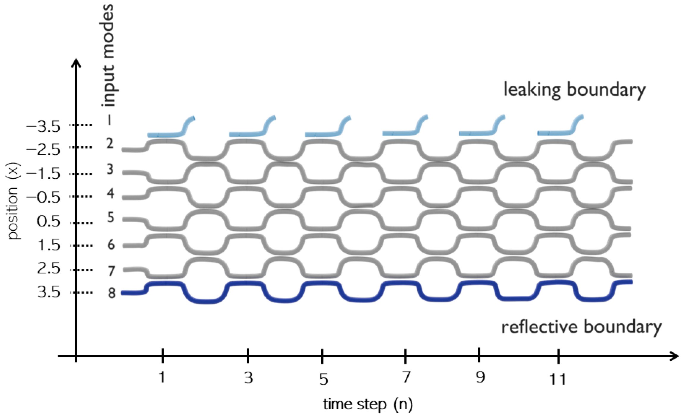 - Ammara, A.; Potoček, V.; Štefaňák, M.; Pepe, F.V. Quantum Walk on a Line with Absorbing Boundaries. arXiv 2025, arXiv:2508.13318. [Google Scholar] [CrossRef]