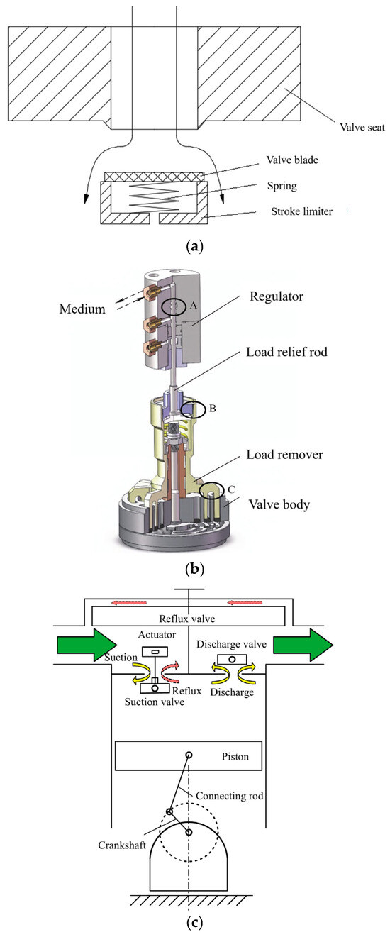 - Cui, W.; Fu, X.; Hong, X.; Wang, D.; Liu, D.; Cao, X. Review of suction valve capacity regulation technology in reciprocating compressor. Renew. Sustain. Energy Rev. 2025, 213, 115435. [Google Scholar] [CrossRef]