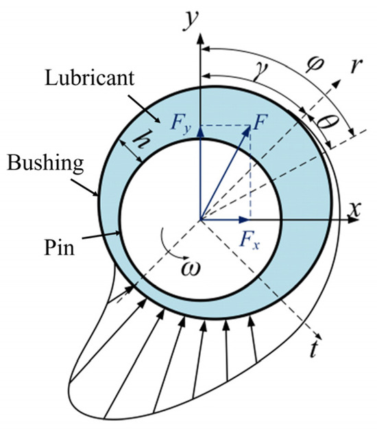 Figure 3 shows the schematic diagram of the small-end-bearing lubrication model. The lubrication mechanism of the connecting rod small-end bushing is investigated, a mathematical model is established, the lubrication state is determined via key parameters, and the wide-range variation characteristics of the coefficient of friction (COF) are examined [23]. (The governing equations of this model are original derivations of this paper with no reference to any external literature). The relative motion between the journal and the bearing mainly includes three modes: full-film lubrication, mixed lubrication, and rough contact. Therefore, there are fluid lubrication zones and contact zones on the mating surfaces. In the lubrication zone, the average Reynolds equation considers the influence of surface topography on fluid lubrication and is suitable for solving the oil film pressure distribution in mixed lubrication:
