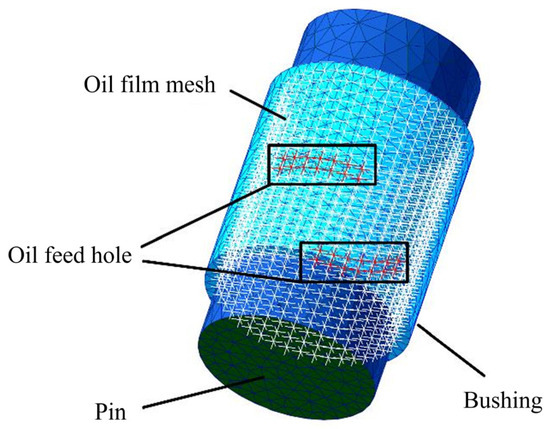 An EHD model was established between the crosshead pin and bushing. The parameter settings are shown in Table 1. The oil film calculation domain was meshed and oil holes were set. The oil holes were rectangular with a width of 12 mm and a single span of 60 °, as shown in Figure 4.