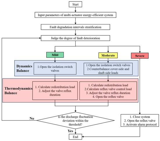 In the case of actuator failure, the self-recovery control principle of the compressor multi-actuator energy-efficient system ensures that the compressor’s displacement can still be effectively regulated even when the system fails, while maintaining the force balance of the compressor’s transmission components and preserving the system’s energy-saving effect. To achieve these goals, dynamic and thermodynamic balance of the system is required, and the flowchart is shown in Figure 5. First, after detecting fault information, the system evaluates the fault degradation severity, mainly based on the variation amplitude of compressor displacement, the load difference amplitude between the head side and crank side, and the reduction amplitude of system energy-saving rate; second, the corresponding self-recovery control strategy is selected according to the fault degradation severity, as shown in Table 2; furthermore, through the load redistribution calculation of actuators, the regulation calculation of reflux valves, and the energy-saving rate calculation of the system, the specific PHM self-recovery algorithm can be obtained, and its pseudocode is shown in Algorithm 1.