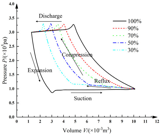 The P-V diagrams under different loads are shown in Figure 8. Their variation trends align with the theoretically calculated dynamic pressure changes in the compressor. The duration of the reflux process varies with load: as load decreases, reflux time increases, discharge time shortens, and discharge volume reduces. As the area enclosed by the P-V diagram decreases, compressor work output reduces and energy-saving rate correspondingly increases.