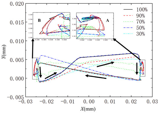 The oil film forces under different loads are presented in Figure 9. Their variation patterns match the theoretical resultant piston force calculations. Under all load conditions, distinct impact phenomena are observed in Zone B near the piston reversal point. This is because the piston must overcome significant inertial forces during motion reversal. Simultaneously, gas force changes occur when the inner cylinder transitions from discharge to expansion and the outer cylinder shifts from suction to reflux or compression. The superposition of these forces creates a pronounced impact.