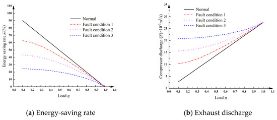 Changes in system energy-saving rate and compressor discharge under different fault conditions.