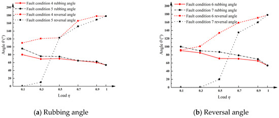 Changes in compressor rubbing angle and reversal angle under different fault conditions.