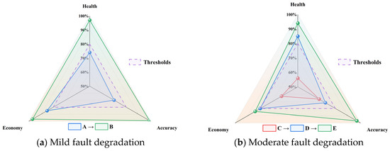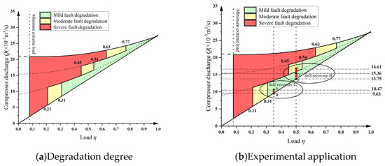 According to the multi-actuator air volume regulation model, the fault degradation severity under variable load conditions can be evaluated based on two key indicators: the minimum limit load of individual actuators and the reduction amplitude of the energy-saving rate of the air volume regulation system . Table 5 presents the boundary loads for classifying fault degradation severity. Using these boundary load divisions, the corresponding compressor fault degradation severity diagram can be plotted, as shown in Figure 14a for the test bench compressor.