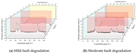 In Figure 15, Curve Fault Degradation II represents moderate fault degradation, with a normal operating load of 0.5. A fault occurred at time F2, where actuator C3 failed, causing a sudden load increase that rapidly raised the discharge volume to 1.661 × 10−2 m3/s. The PHM self-recovery algorithm was immediately activated, employing Self-recovery Regulation Strategy II. At time C, the faulty actuator was isolated; connecting-rod small-end bush tribological behaviors were improved by counterbalancing cover-side and shaft-side loads, and fault progression was timely suppressed through load redistribution adjustment, reducing the discharge volume to 1.536 × 10−2 m3/s at time D. Subsequently, adjustment of the reflux valve flow area was performed at time D, restoring the discharge volume to normal at time E.