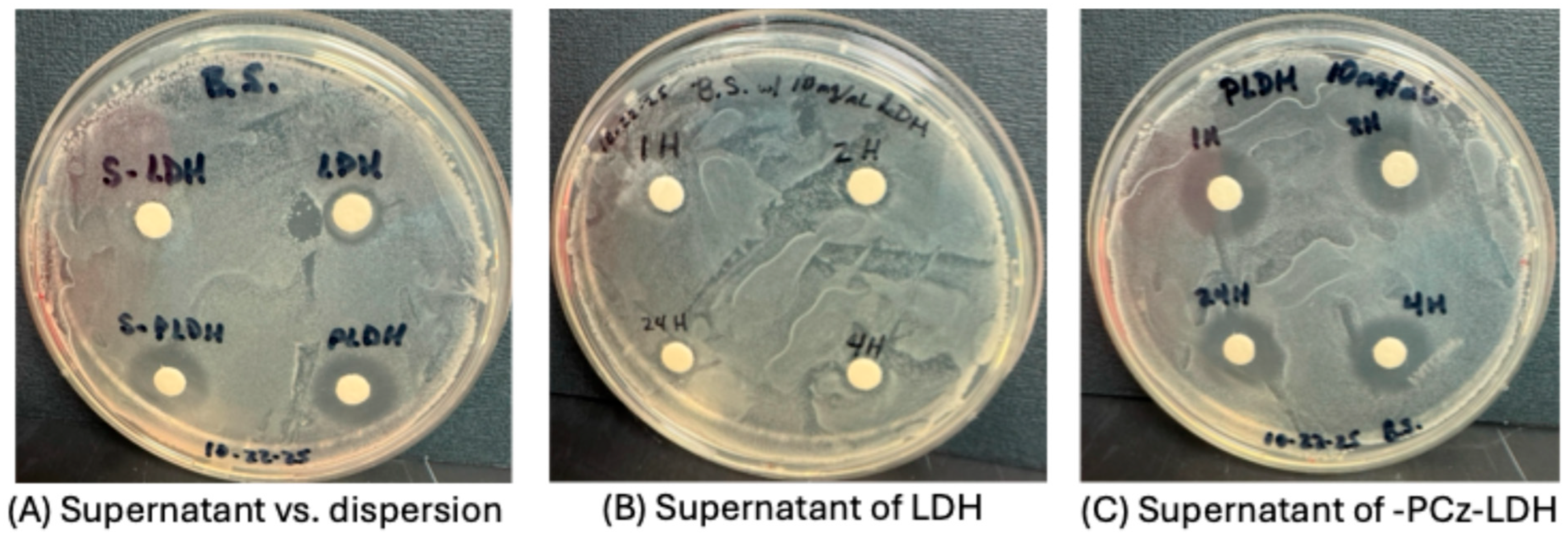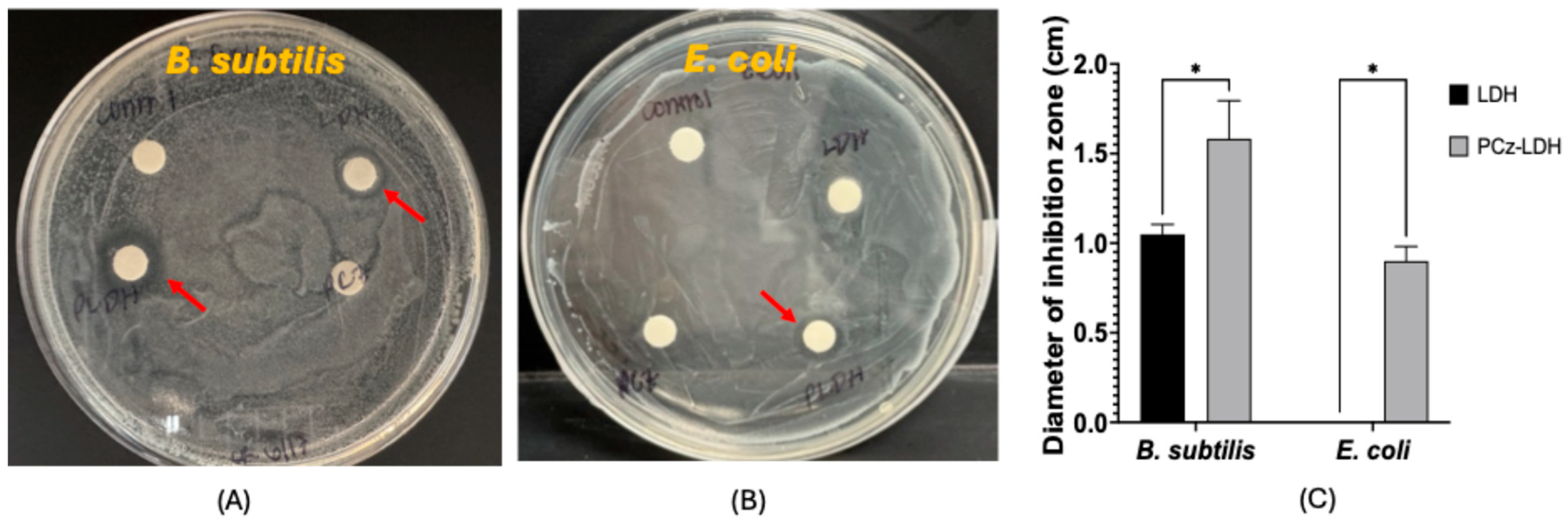 3.2. Zone Inhibition Effects of LDH and Pcz-LDH on B. subtilis and E. coli