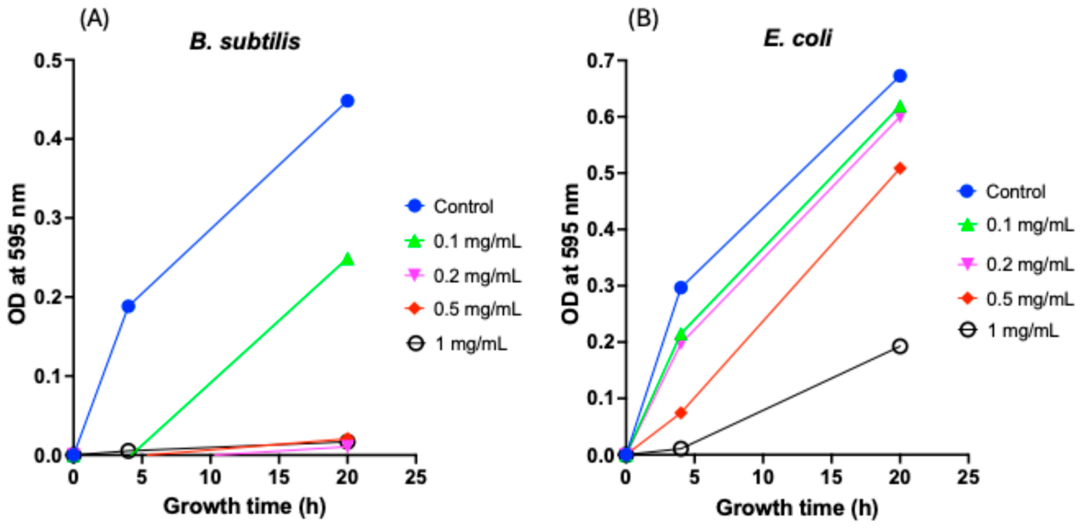 3.4. MBC and Time-Dependent and Concentration-Dependent Inactivation of B. subtilis