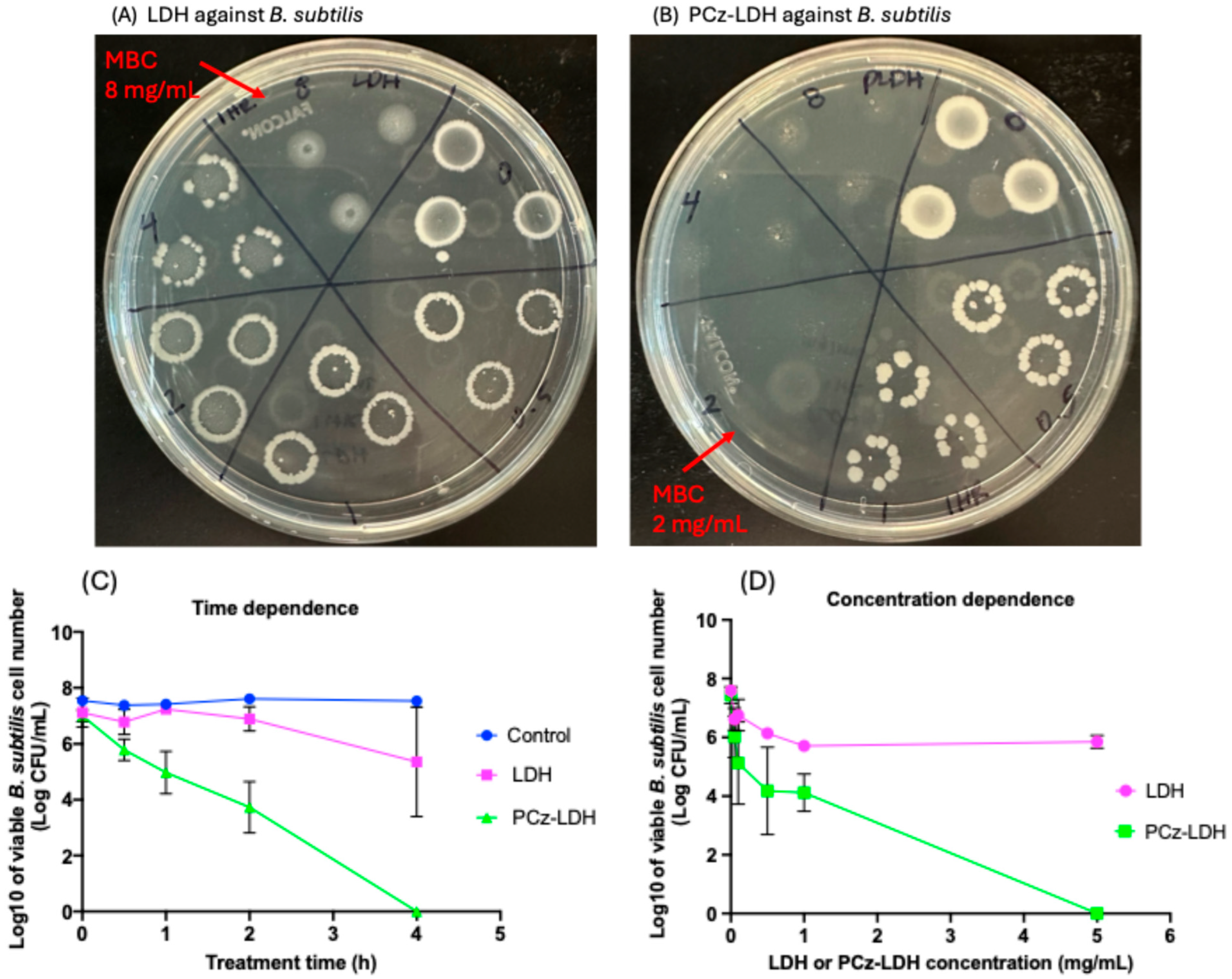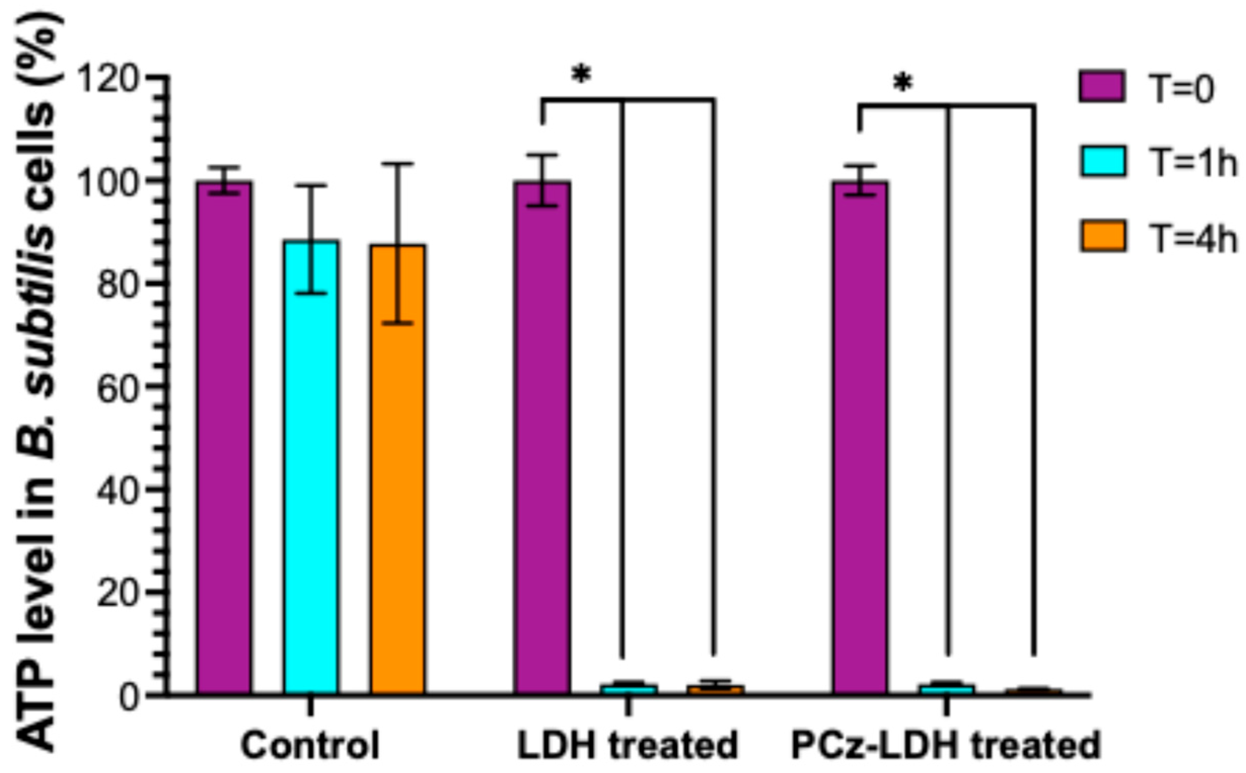 3.5. ATP Levels in LDH- and PCz-LDH-Treated B. subtilis Cells
