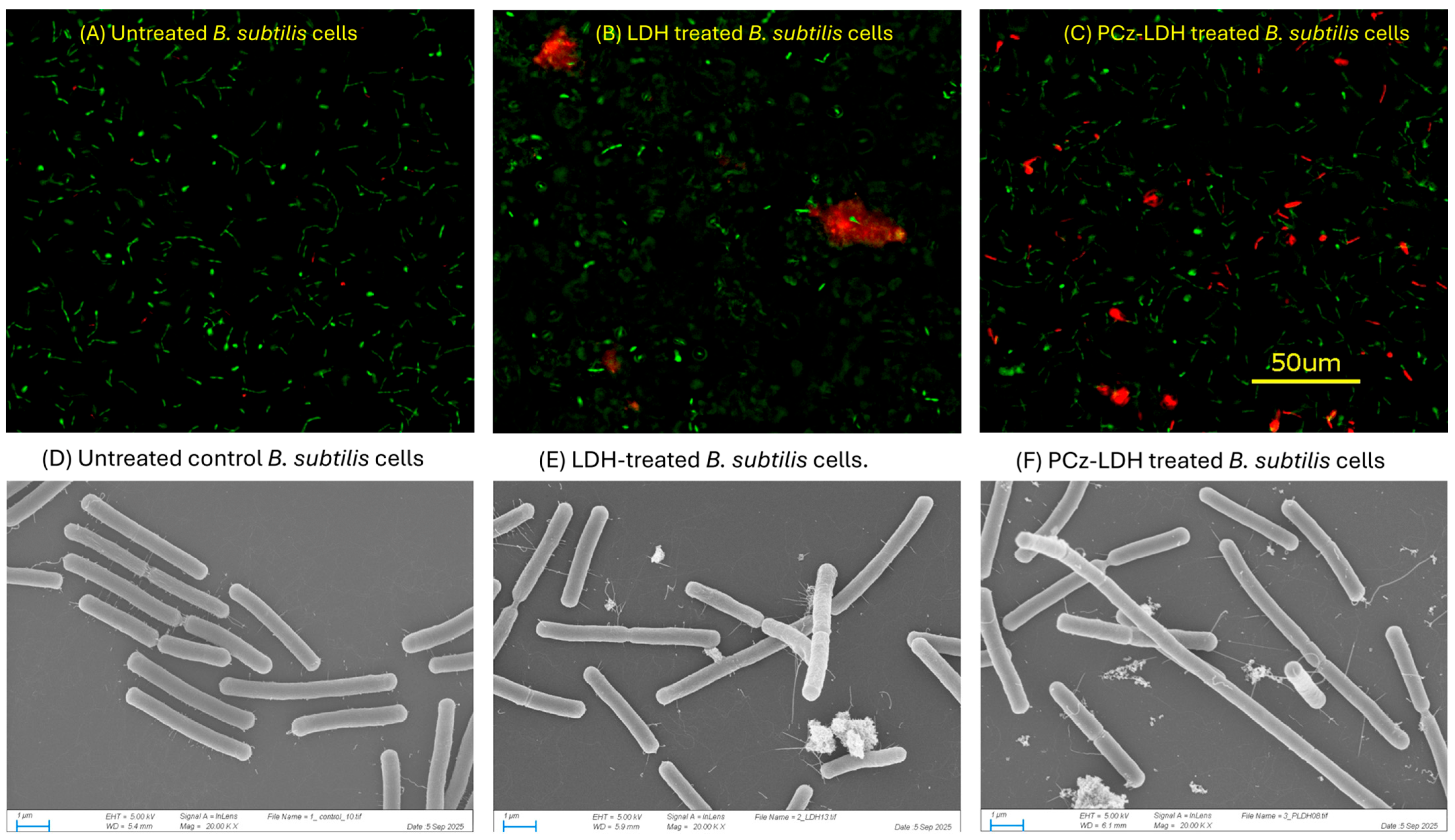 3.6. Live/Dead Staining and SEM Imaging of LDH- and PCz-LDH-Treated B. subtilis Cells