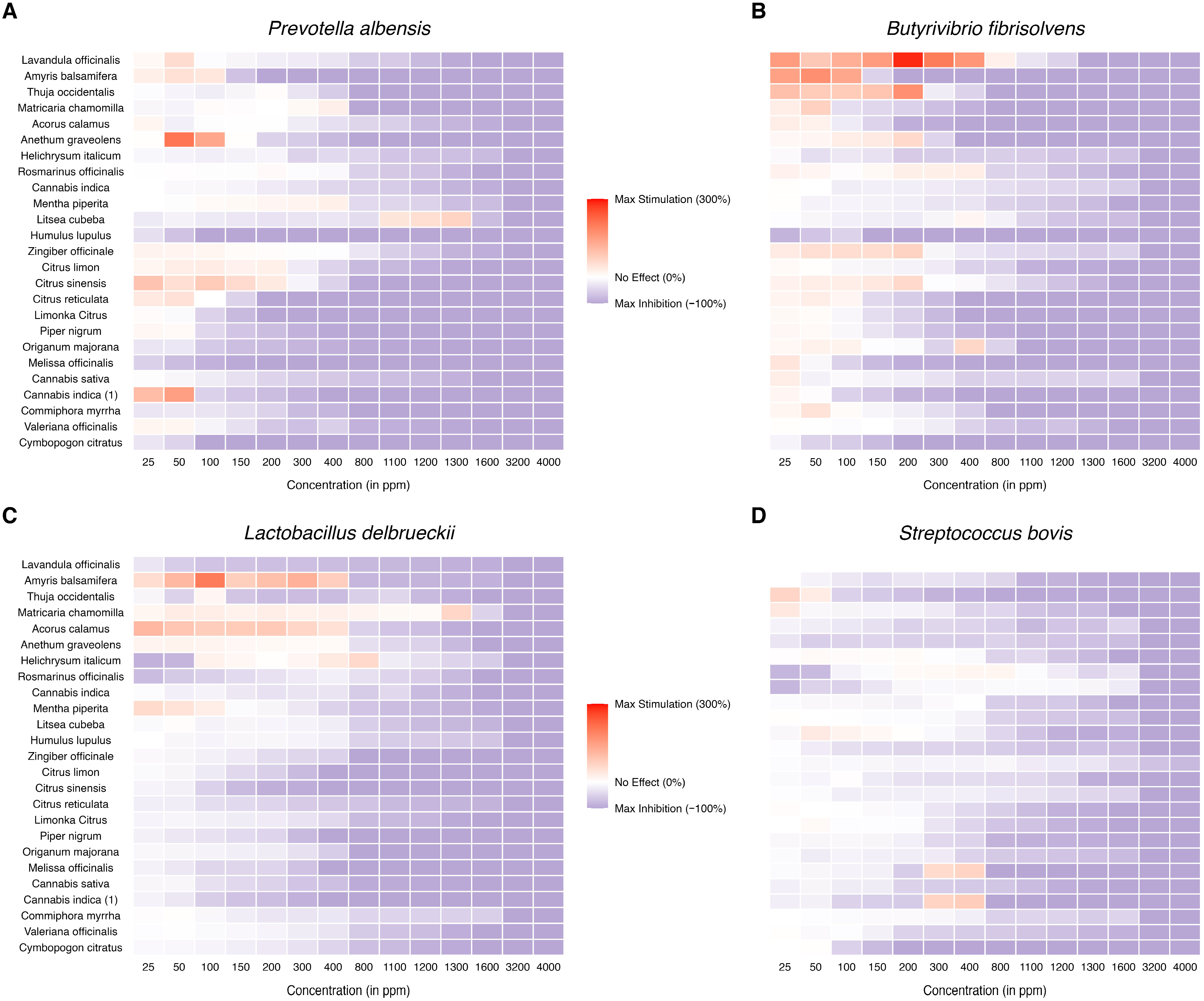 | Essential Oil | Butyrovibrio fibrosolvens | Prevotella albensis | Lactobacillus delbrueckii ssp. Lsactis | Streptoccoccus bovis | ||||
