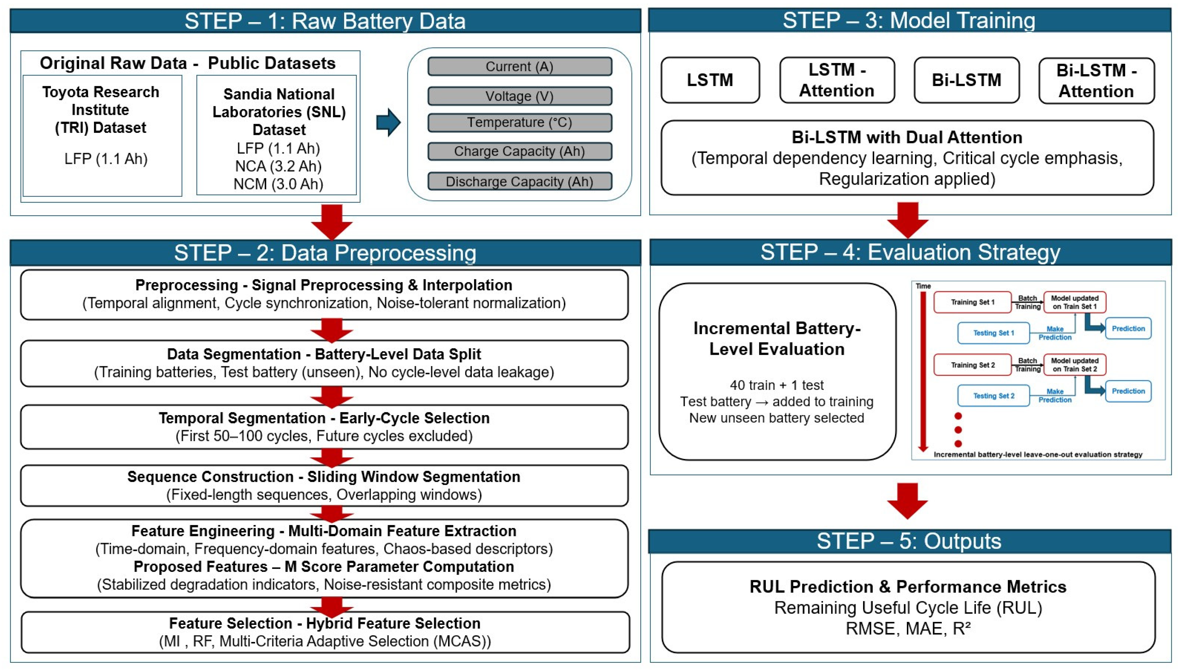 Despite their respective merits, these approaches primarily rely on static regression formulations or chemistry-specific feature mappings and are therefore limited in their capacity to capture long-range temporal dependencies and complex multi-domain interactions inherent in battery degradation sequences. In contrast, the proposed framework explicitly integrates MCAS-based feature refinement with a dual-attention mechanism, enabling the simultaneous modeling of temporal dynamics and feature-level relevance within a unified recurrent architecture.