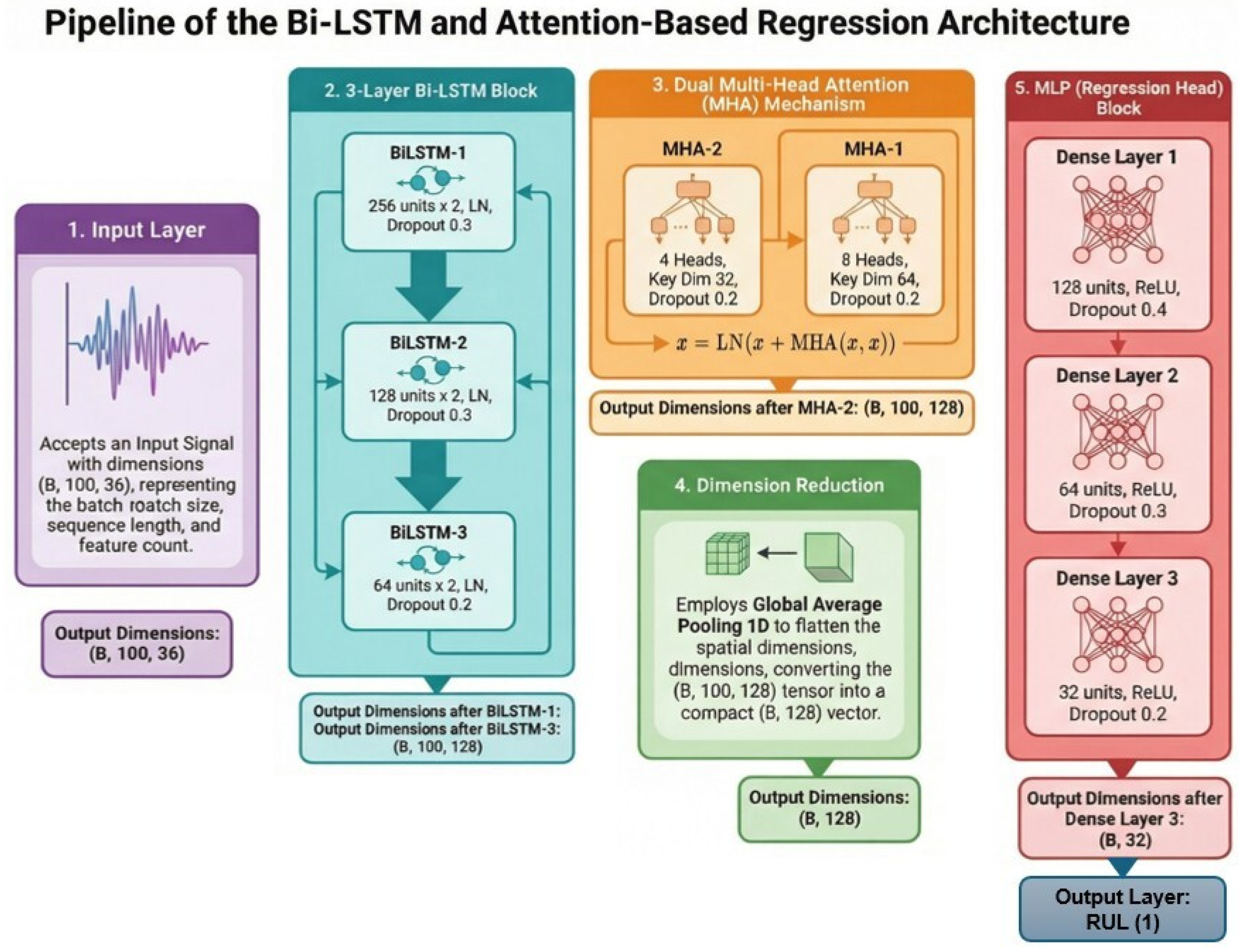From a theoretical perspective, the computational complexity of the proposed architecture is primarily driven by the stacked Bi-LSTM layers and the dual attention mechanism. For a sequence of length , hidden dimension , and attention key dimension , each Bi-LSTM layer has a time complexity of , due to the recurrent operations in both forward and backward directions. The dual multi-head attention module adds further complexity of . In this design, these costs are carefully managed through several measures: the sequence length is fixed at a moderate 100 cycles, the number of hidden units is progressively reduced across Bi-LSTM layers, and the attention modules are configured with smaller key dimensions to avoid excessive overhead. As a result, the quadratic cost of attention does not dominate the overall computational load.
