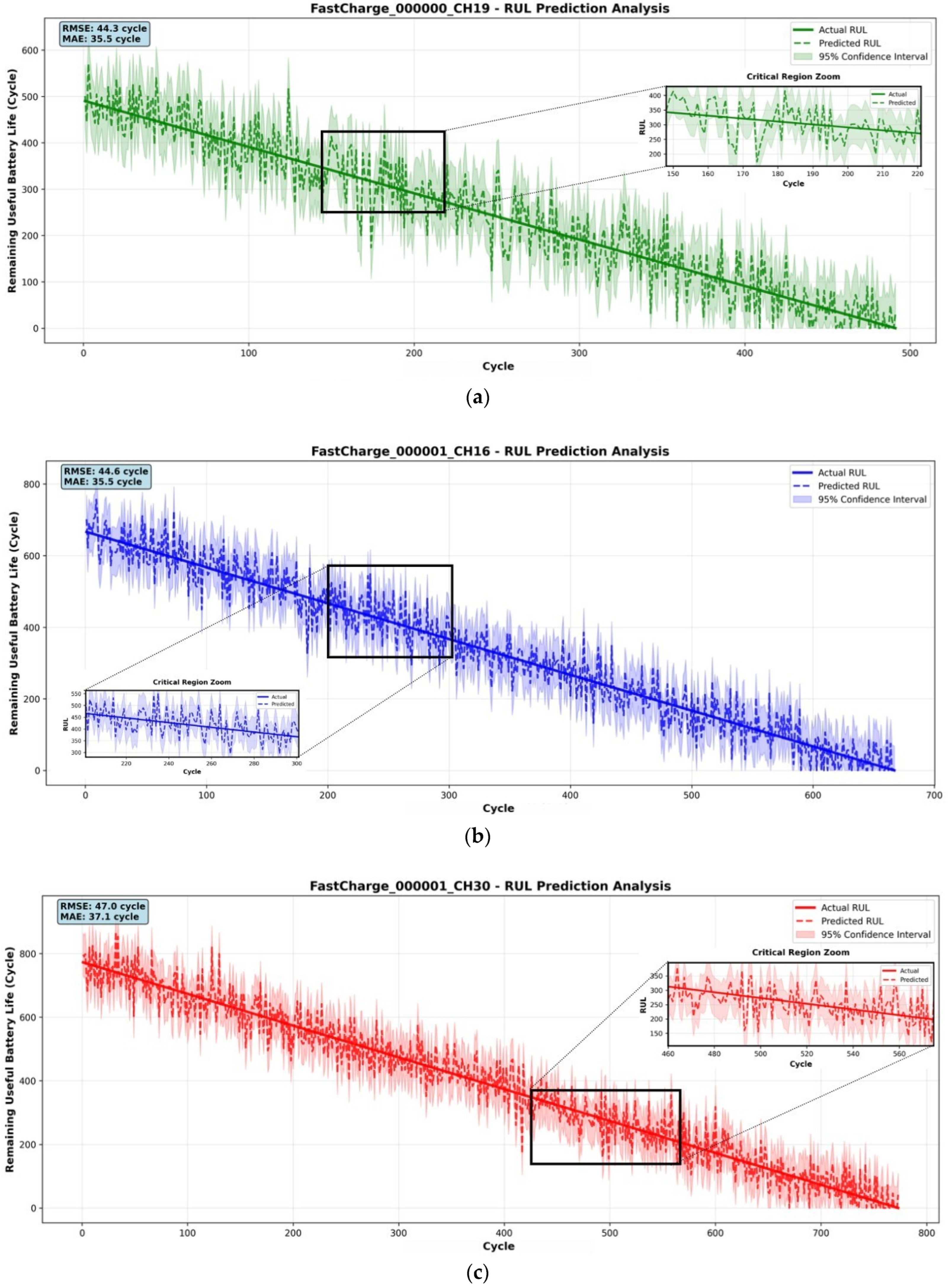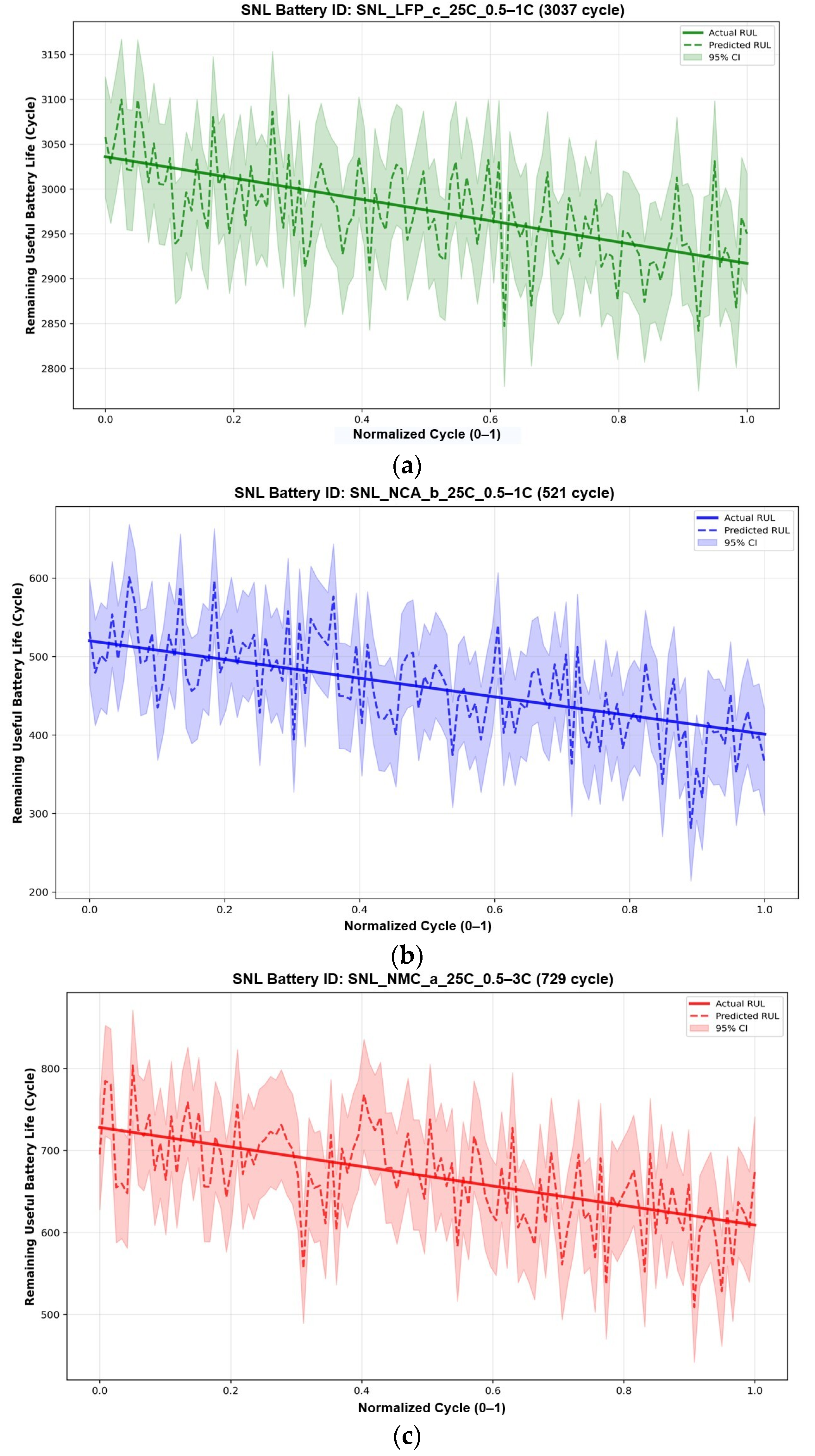 Across all SNL chemistries, the proposed model achieves RMSE = 280.5 cycles, MAE = 198.7 cycles, and R2 = 0.9623, indicating strong generalization and robustness, particularly under the highly nonlinear degradation behavior observed in NCA cells. While absolute error magnitudes may vary across studies due to differences in target definitions, evaluation protocols, and units of measurement, the proposed framework consistently demonstrates a favorable balance between predictive accuracy and interpretability. Collectively, the results indicate that combining MCAS-guided feature selection with dual-attention-based temporal modeling supports robust and scalable RUL estimation in heterogeneous battery systems.