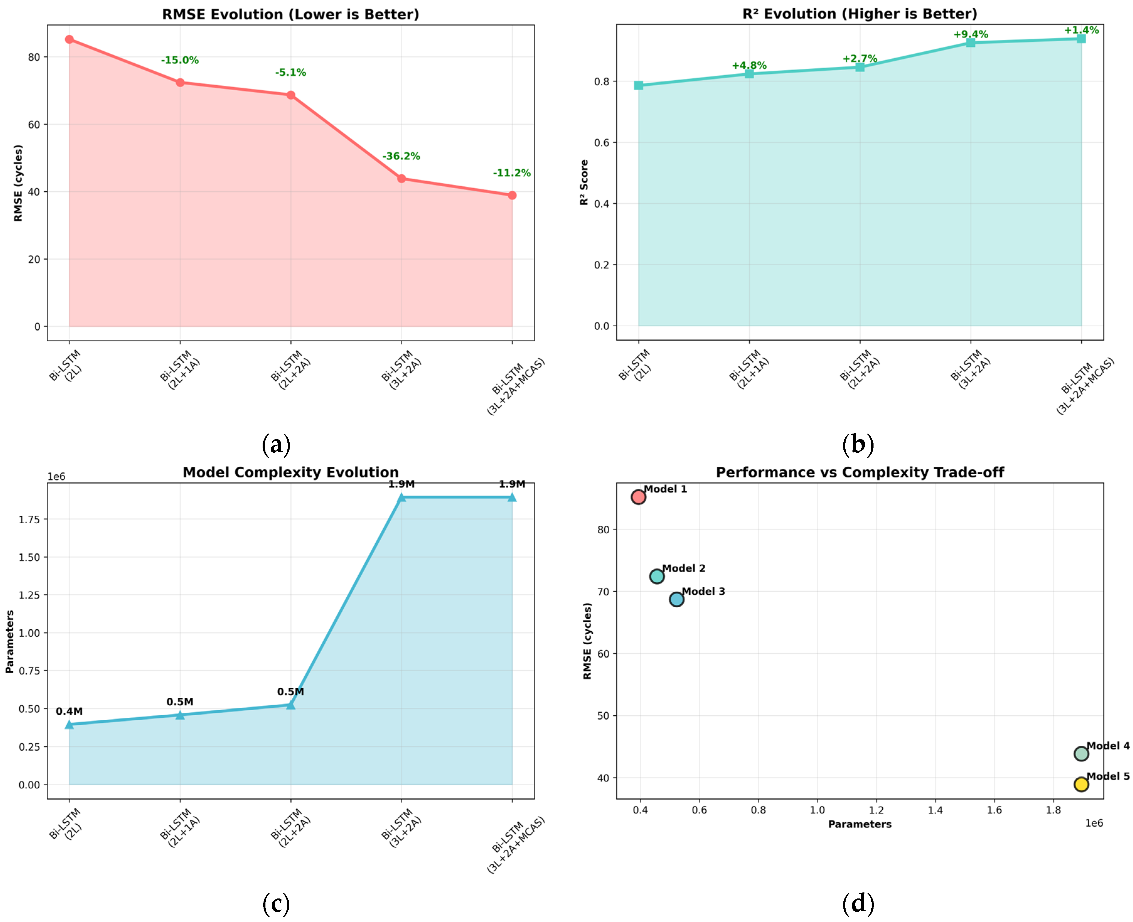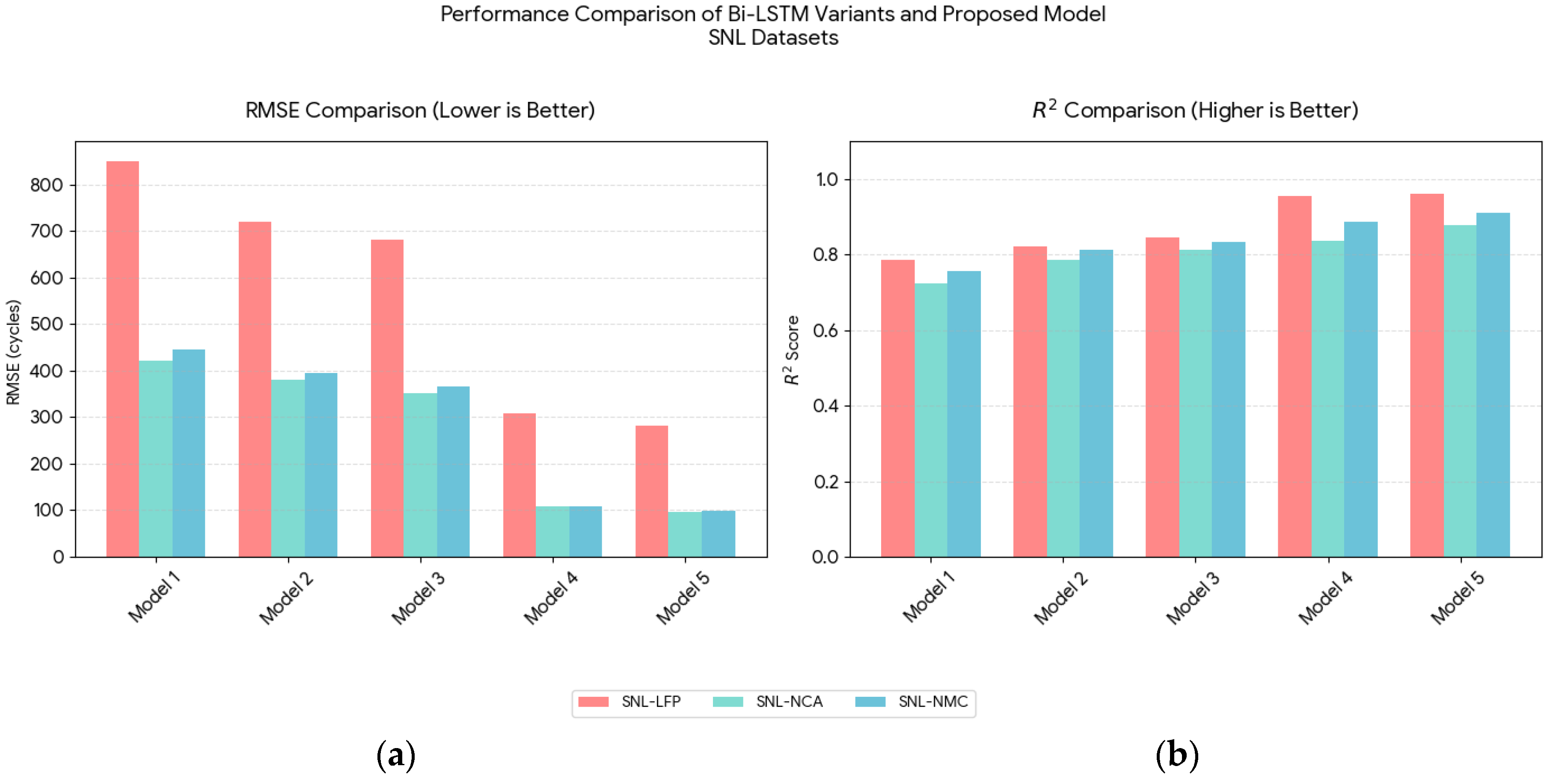 Transformer-based models have also shown promising performance on large-scale battery datasets; however, their effective deployment typically requires extensive hyperparameter optimization and dataset-specific input representations. In this study, the transformer was intentionally implemented as a parameter-matched but non-optimized baseline, and its performance should therefore be interpreted as indicative rather than exhaustive. By contrast, the proposed Bi-LSTM architecture with dual attention explicitly integrates domain-informed feature selection and attention-based temporal modeling within a unified and interpretable framework. Using 36 MCAS-selected features from an initial pool of 161 indicators, the proposed approach achieves a test RMSE of 43.85 cycles on 40 TRI batteries. These results show that combining adaptive multi-criteria feature selection with interpretable attention mechanisms improves both predictive accuracy and transparency by emphasizing degradation-relevant temporal segments and feature interactions.