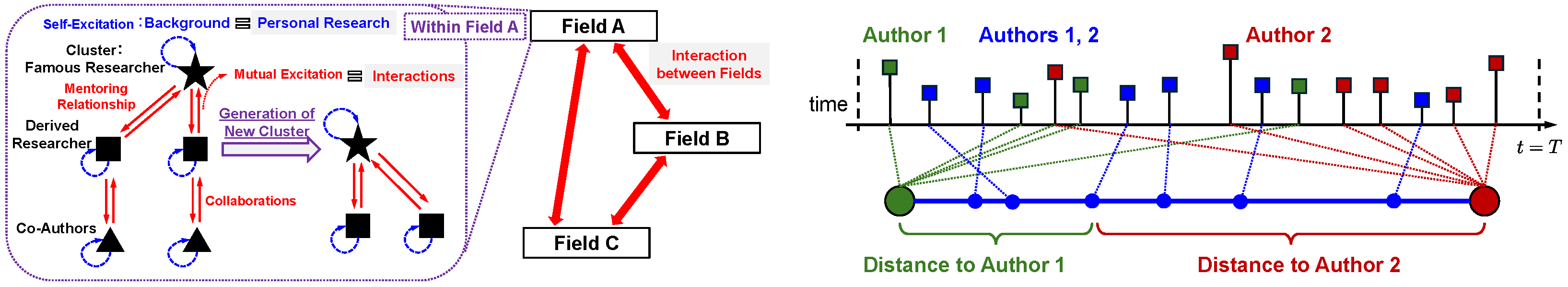 - Unified modeling of heterogeneous interactions. We provide a unified event-driven framework that can incorporate multiple academic interaction channels (e.g., citations and collaboration-related signals) through a shared intensity construction, instead of handling each relation with separate ad hoc models.