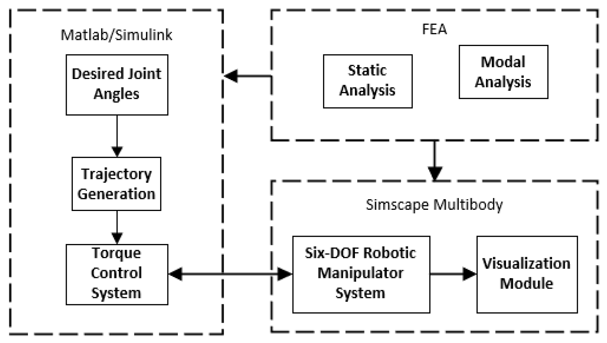 This paper developed an integrated structural–control co-modeling framework for a six-DOF flexible-joint robotic manipulator by coupling ANSYS-based FEA with a MATLAB/Simulink (Simscape Multibody) digital-twin co-simulation environment. Within this framework, FEA was used primarily as a parameter identification tool to extract joint-level equivalent stiffness, inertia, and modal/damping-related characteristics, which were then mapped into a control-oriented joint-space dynamics model and embedded into the digital-twin plant for closed-loop verification.