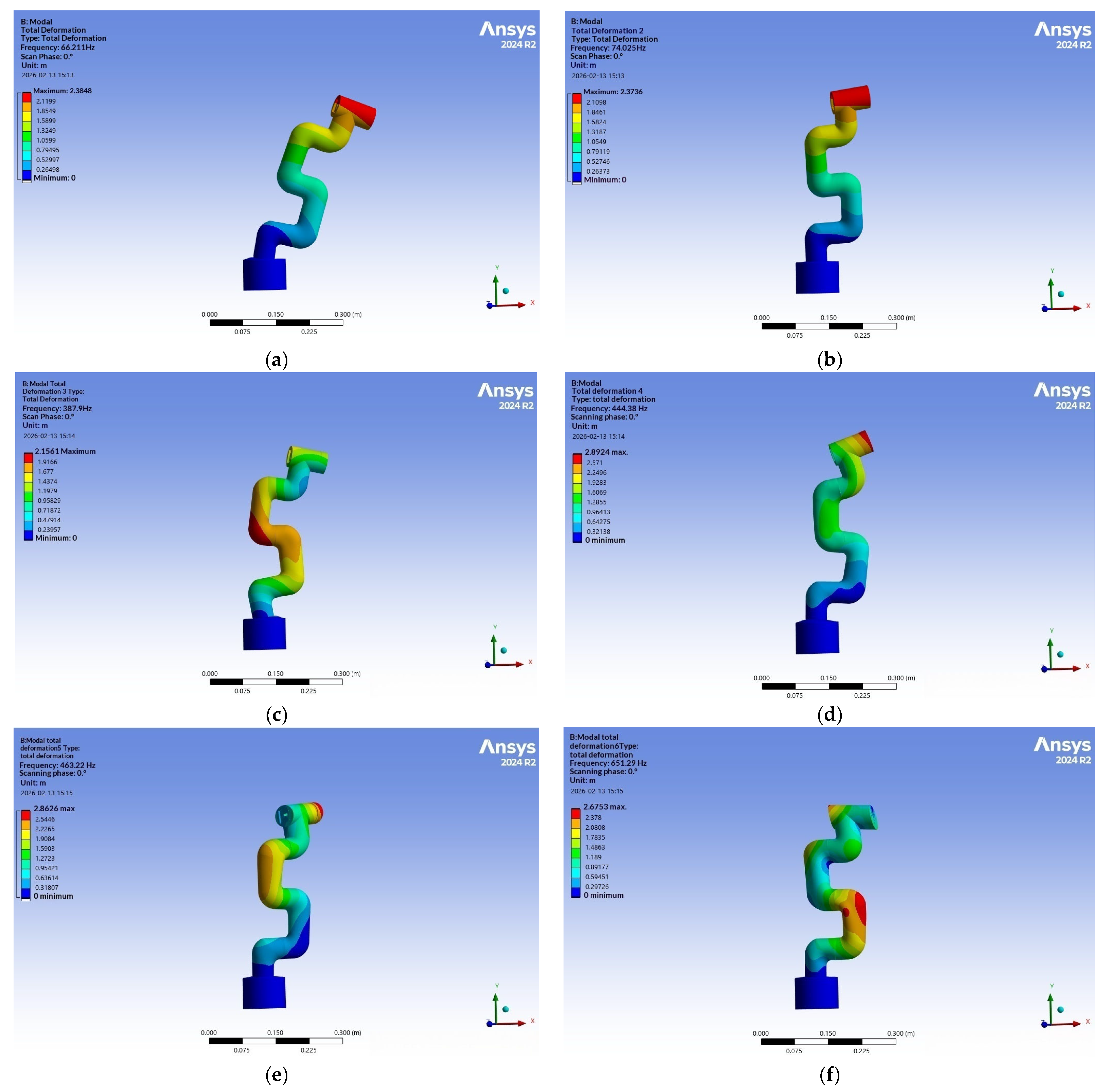 Modal analysis is performed on the robotic manipulator to investigate its vibration characteristics. The deformation contours of the first six mode shapes of the manipulator are illustrated in