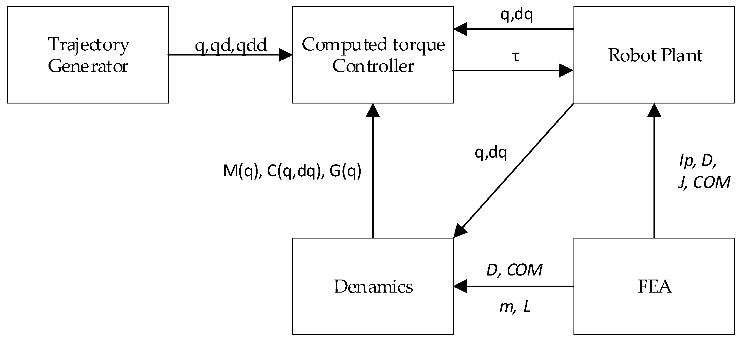 The computed torque controller receives the desired signals together with the measured joint states from the robot plant. Structural parameters extracted from the finite element analysis (FEA) model, including the link masses , link lengths , equivalent joint inertia , equivalent stiffness , and center-of-mass (COM) information, are supplied to the dynamic model. These parameters are used to compute the inertia matrix , Coriolis and centrifugal matrix , and gravity vector . Based on these dynamic terms, the controller generates the control torque .