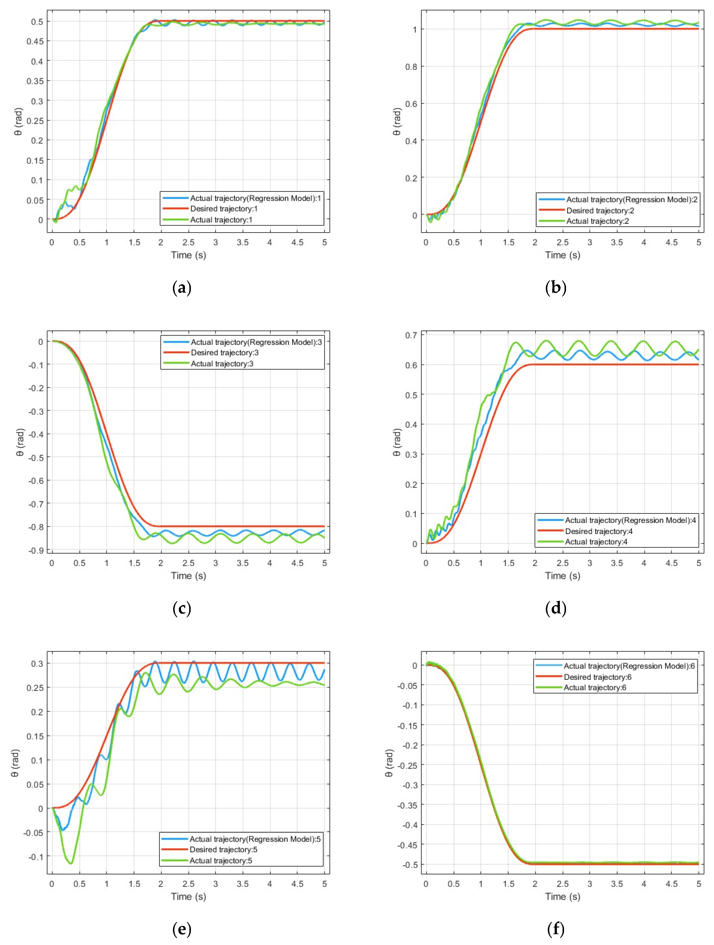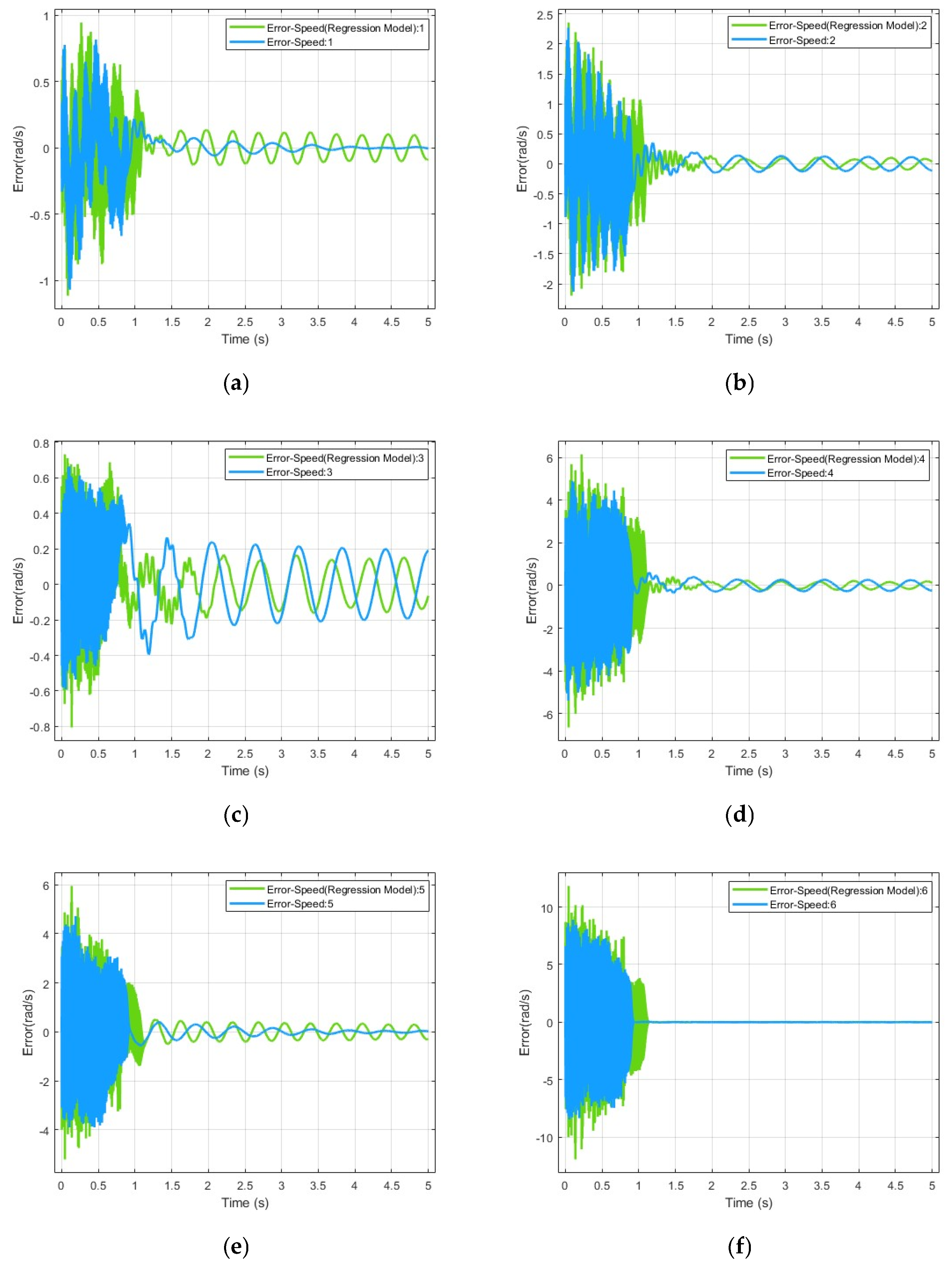 In the steady-state phase, the error responses of the conventional model exhibit persistent and relatively large periodic oscillations, with amplitudes remaining in the range of approximately 0.04–0.10 rad for most joints. In contrast, the steady-state error amplitudes of the regression-based model are generally reduced to 0.02–0.04 rad, corresponding to an overall oscillation reduction of about 50%. Moreover, the regression-based model achieves faster error convergence, typically reaching a stable oscillatory pattern within 1–1.5 s, whereas the conventional model continues to exhibit pronounced decaying oscillations.