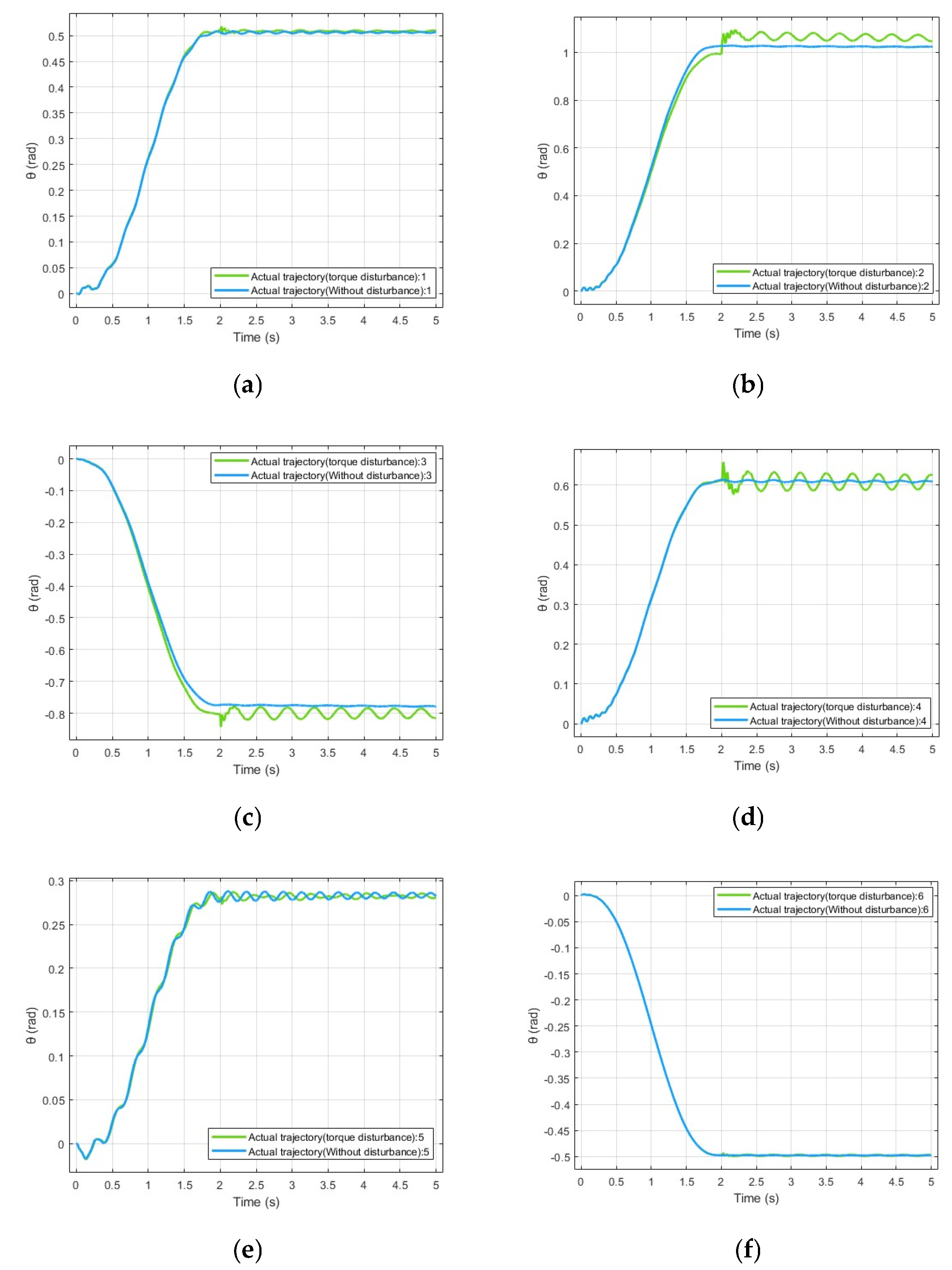 First, the directly disturbed Joint 2 shows persistent periodic oscillations around the steady-state position, with an oscillation amplitude of approximately ±0.02–0.04 rad, whereas a relatively smooth response is maintained in the absence of disturbance. This indicates that the external torque disturbance disrupts the dynamic equilibrium of Joint 2, leading to additional vibration responses.