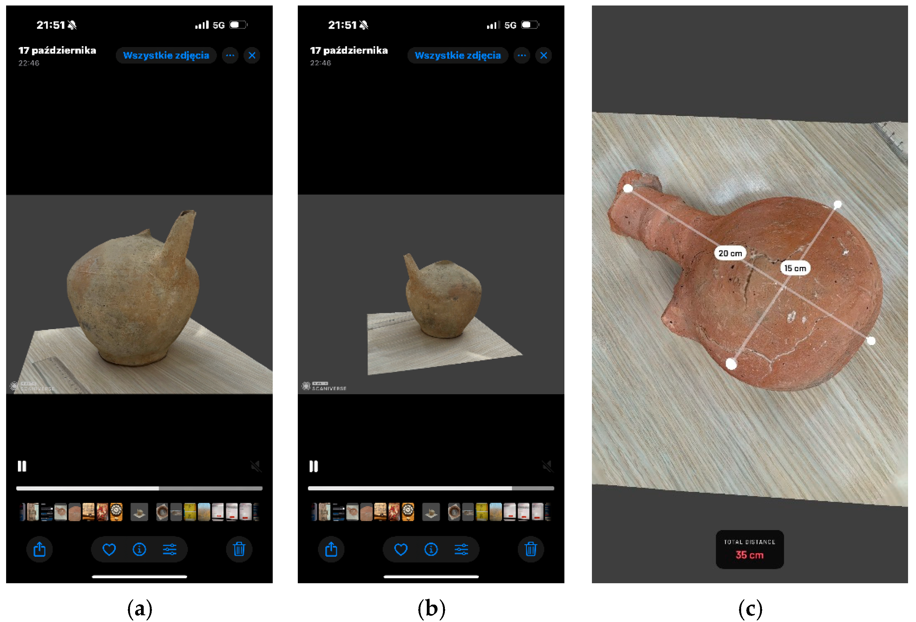 - The LiDAR system available on Apple smartphones and tablets enables the so-called social documentation of historical artefacts (democratisation of activities) and the rapid sharing of results with the public, both by exporting models in formats supported by free, publicly available programs, such as .obj, and by generating short videos of objects rotating along predefined motion paths. This confirms the observations made in [39].