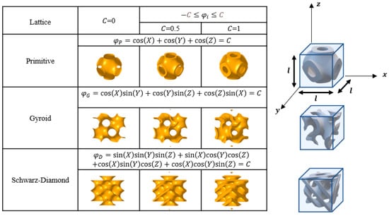 As shown in Figure 1, three sheet−based TPMS lattices are presented: Primitive, Gyroid and Schwarz−Diamond. Where represents the implicit equation of TPMS, , and are constants related to cell size in the x, y, and z directions, respectively. This setting ensures that the period in each direction is exactly equal to the unit cell length . These structures exhibit different wall thicknesses at different values of . When , the structure corresponds to an isosurface in the Cartesian coordinate system; when , the structure refers to the solid region between the original isosurface offset by and along the normal direction.