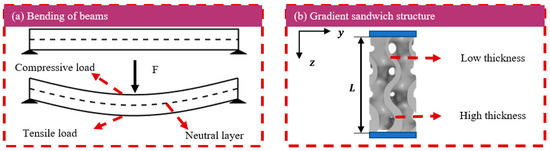 As shown in Figure 2, according to the neutral layer theory of beam bending, the upper region of the beam is subjected to compressive loads while the lower region bears tensile loads during the bending deformation process. Aiming at the mechanical characteristic that the tensile strength of brittle metallic materials is much lower than their compressive strength, designing the core into a gradient structure with a thinner upper region and a thicker lower region can effectively improve the local stiffness of the sandwich beam in a targeted manner.