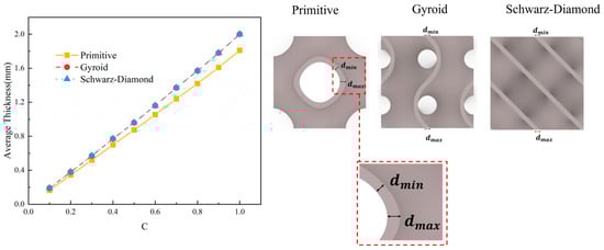 According to the research findings of Hong et al. [33], there is no definite quantitative relationship between parameter and wall thickness t due to the complexity of their topological relationship. However, the wall thickness t of the unit cell can be adjusted by changing . Figure 3 illustrates the quantitative relationship between the offset constant and average thickness, as well as the thickness relationships of three types of topological cells. The average thickness, regarded as the mean of the maximum and minimum thicknesses, is calculated according to Equation (3). It is worth noting that the maximum and minimum thicknesses of Gyroid and Schwarz−Diamond cells are equal because their topological structures exhibit continuity along the thickness normal direction.