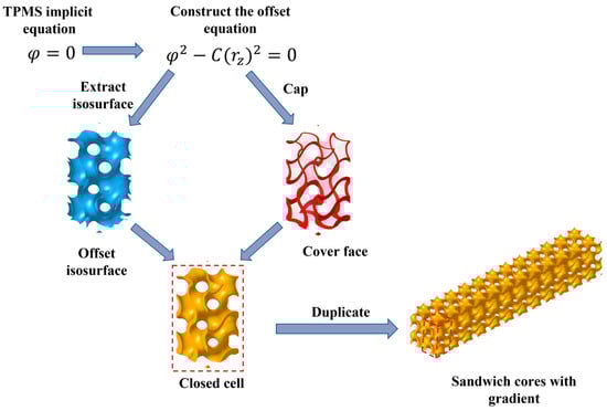 Finally, replicate and array the closed cells along the x and y directions to obtain the gradient−dependent TPMS core structure, with the formation process illustrated in Figure 4.