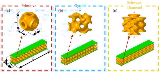 Dimensions of TPMS sandwich structures: (a) Primitive sandwich; (b) Gyroid sandwich; (c) Schwarz−Diamond sandwich.